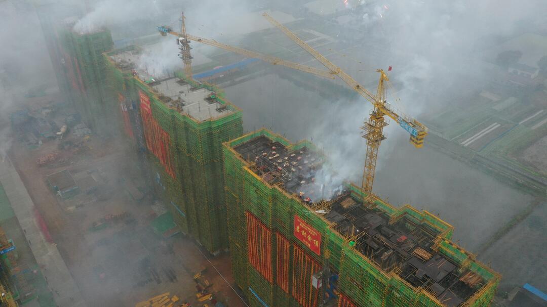 在沅江市禁捕退捕渔民搬迁安置建设项目一期14栋的顶楼,建筑工人正在对屋顶最后一方进行混凝土浇筑,随着铁铲的挥舞,该楼栋最后一方混凝土全部浇筑到位。