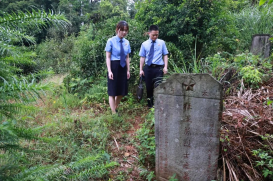 “就是那处墓!检察官,你们看。”沅江市南嘴镇百家沟村一位姓胡的老人,指着孤居深山的一处墓地,对该市检察院的检察官说。据老人介绍,墓地主人是一位因公牺牲的广东籍革命战士,墓地已有近五十年,往年鲜有人来悼念,也没有人来管护。