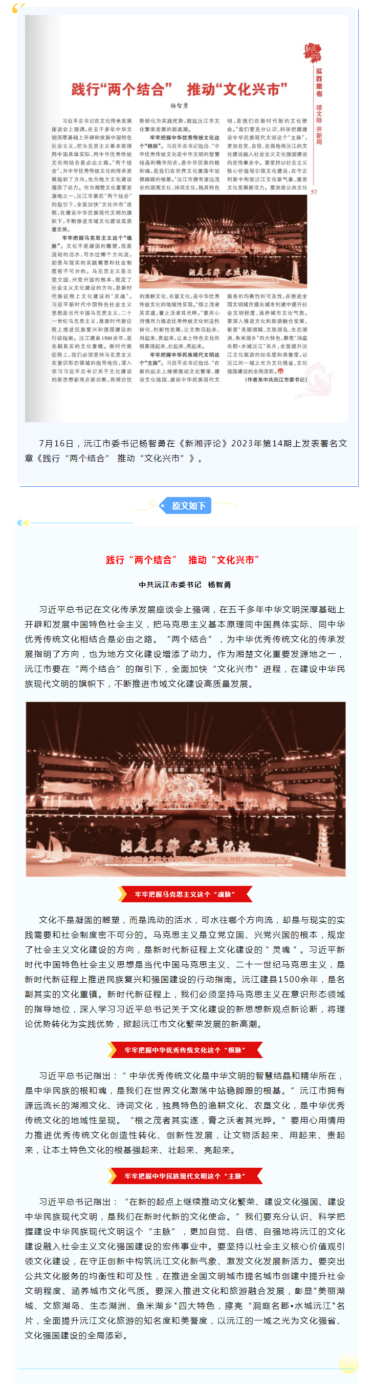 杨智勇在《新湘评论》发表署名文章:践行“两个结合” 推动“文化兴市”