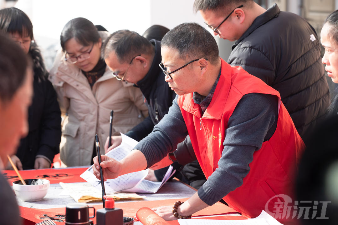 走进泗湖山镇“村晚”现场,映入眼帘的是一排展台,上面摆满了该镇的土特产,一箱箱色泽鲜艳的脐橙吸引了众多群众驻足、挑选。穿过一排红拱门,就来到了“迎春送福”写春联现场,不少村民在挑选自己中意的春联后,请来自文联的书法大师书写,然后将其晾干,准备春节前贴到自家门墙上,增添些许喜气,过个热闹年。