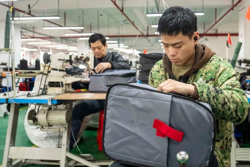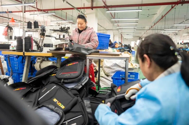 2023年6月,龚伟华将公司从外地搬回家乡沅江,三层楼高的厂房占地近4000平方米。记者在厂房看到,经过裁剪、缝制等环节,一个个双肩包被制造出来,等待质检。