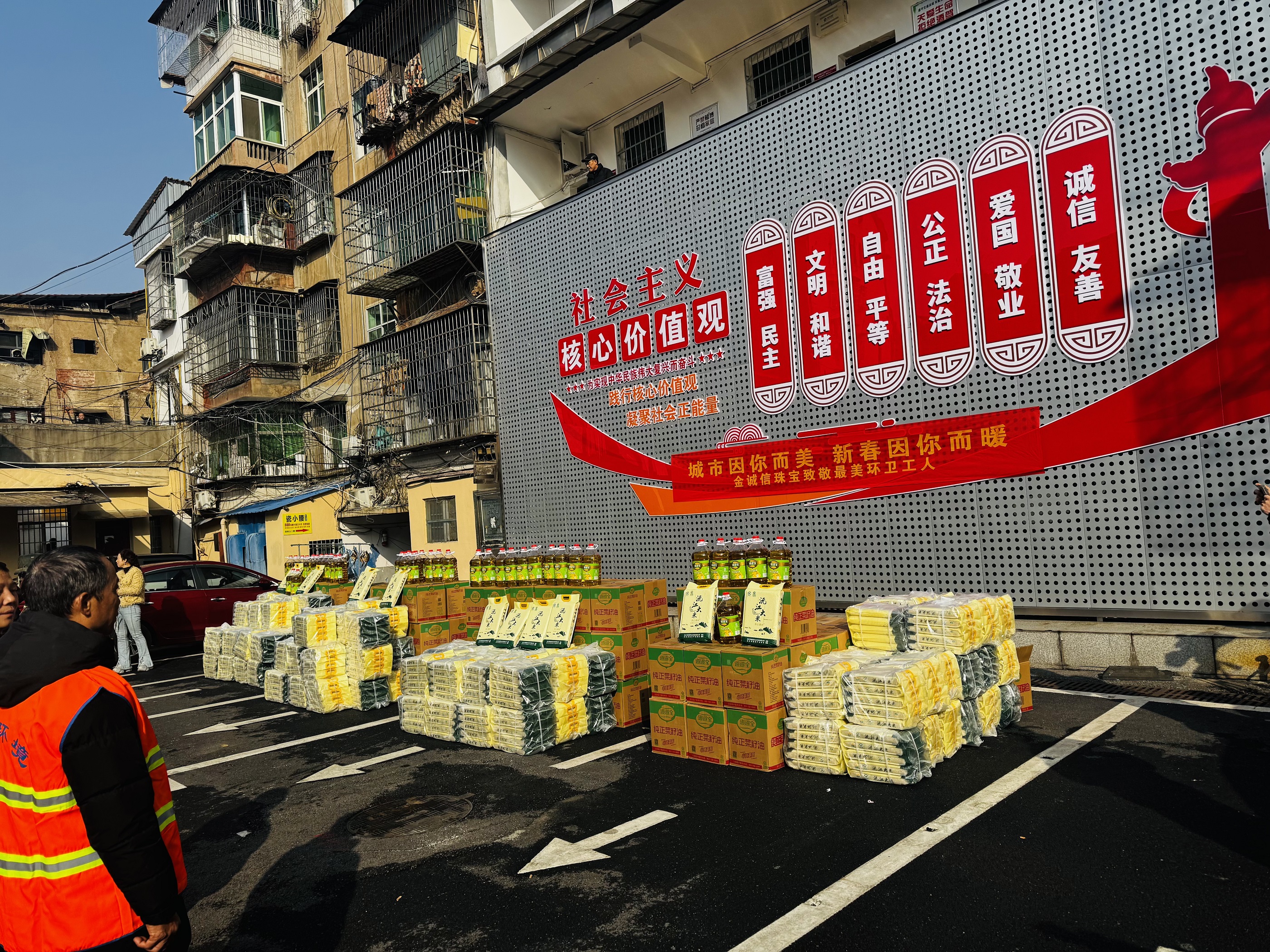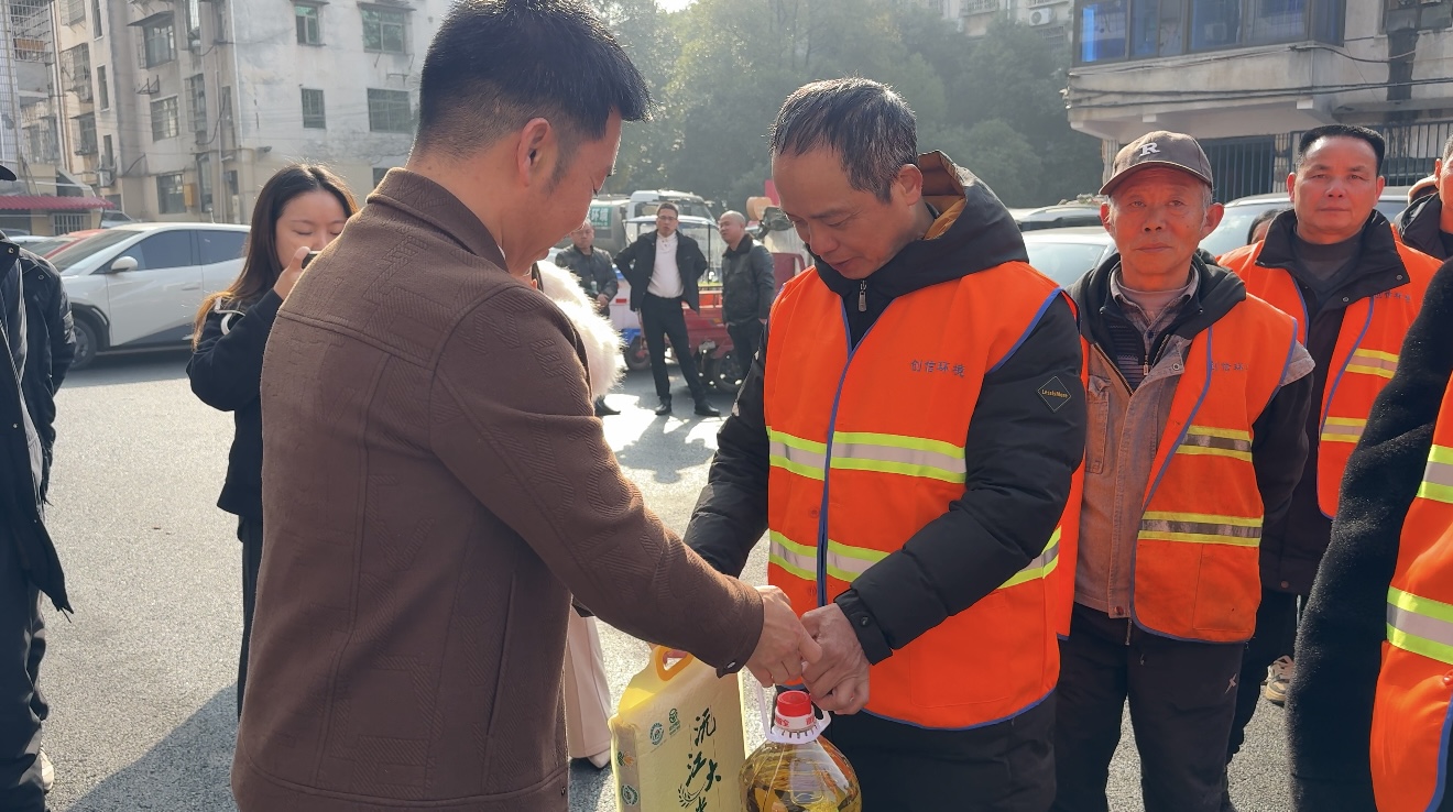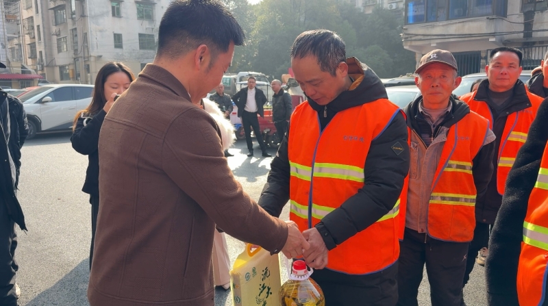 活动现场暖意融融,爱心涌动。一袋袋大米、一桶桶食用油整齐摆放,切实贴合环卫工人的日常生活所需,每一份物资都承载着企业对一线劳动者最真切的关怀与敬意。