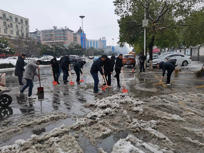 大家逐段清理、有序推进,特别是对人行道、坡路、台阶等行人、车辆易滑路段,进行反复推铲与清扫,确保过往行人、车辆的安全,热火朝天的劳动场面让严寒的天气也显得暖意浓浓。
