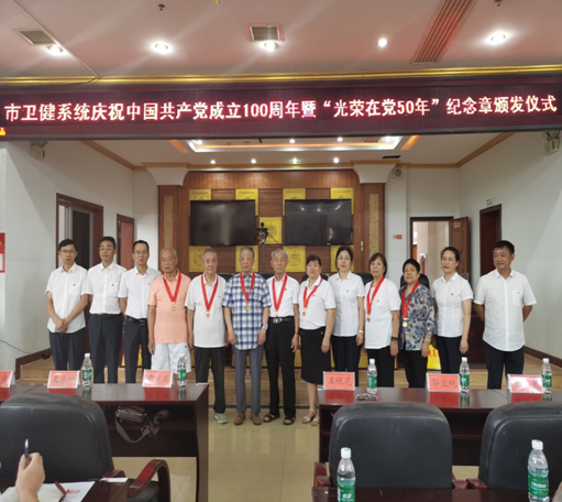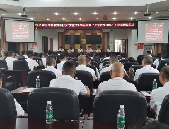 6月29日上午,沅江市卫健系统庆祝中国共产党成立100周年暨“光荣在党50年”纪念章颁发仪式在市卫健局机关四楼会议室举行。会议由局党组副书记、副局长吴建伟主持,局党组书记、局长郭云出席会议并作重要讲话,局机关全体在家班子成员、正(副)股室站长、各医疗卫生单位党政负责人以及“光荣在党50年”党员代表和受表彰的对象等110人参加会议。