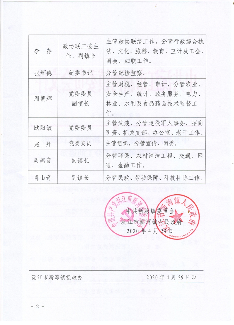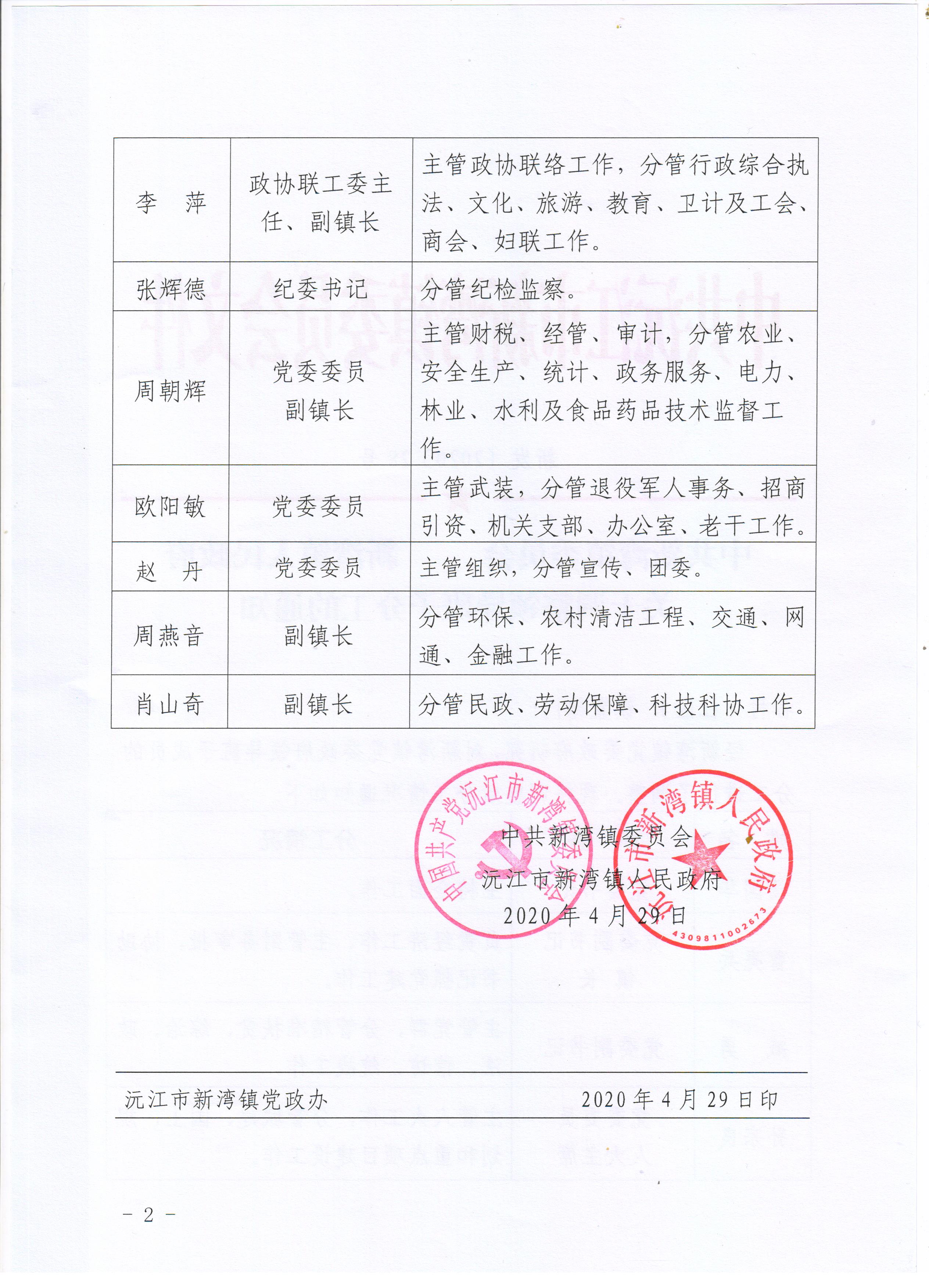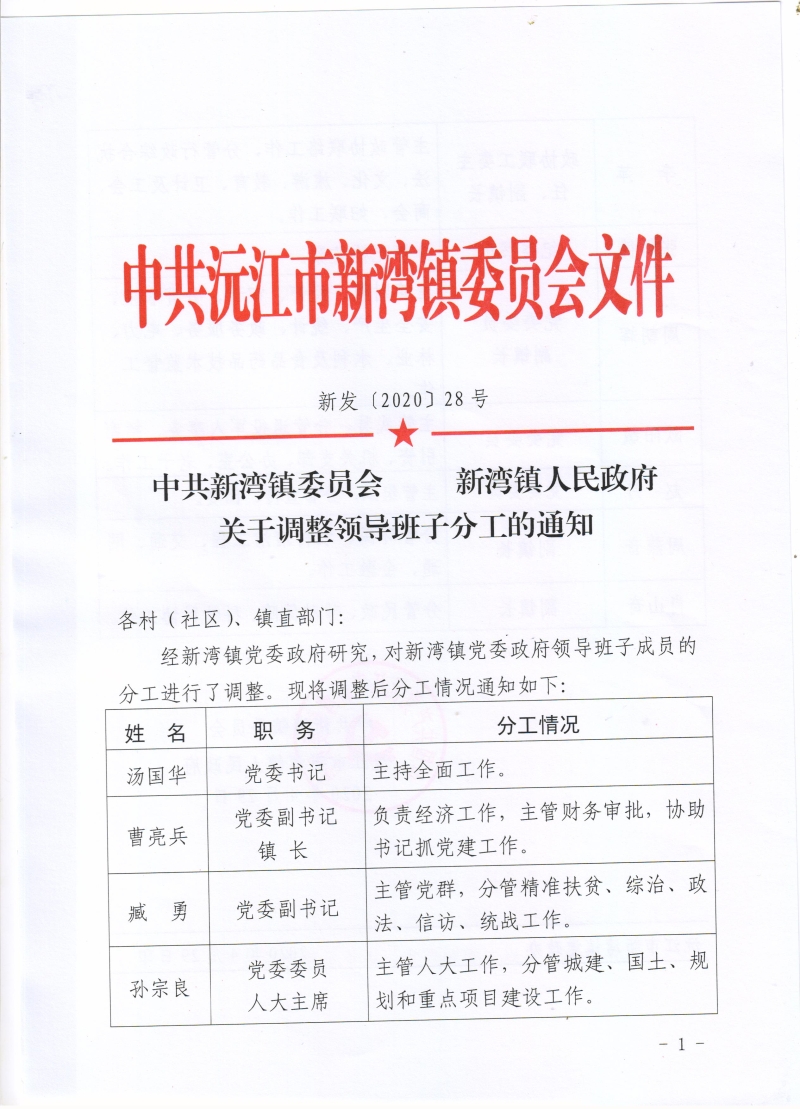 中共新湾镇委员会 新湾镇人民政府 关于调整领导班子分工的通知
