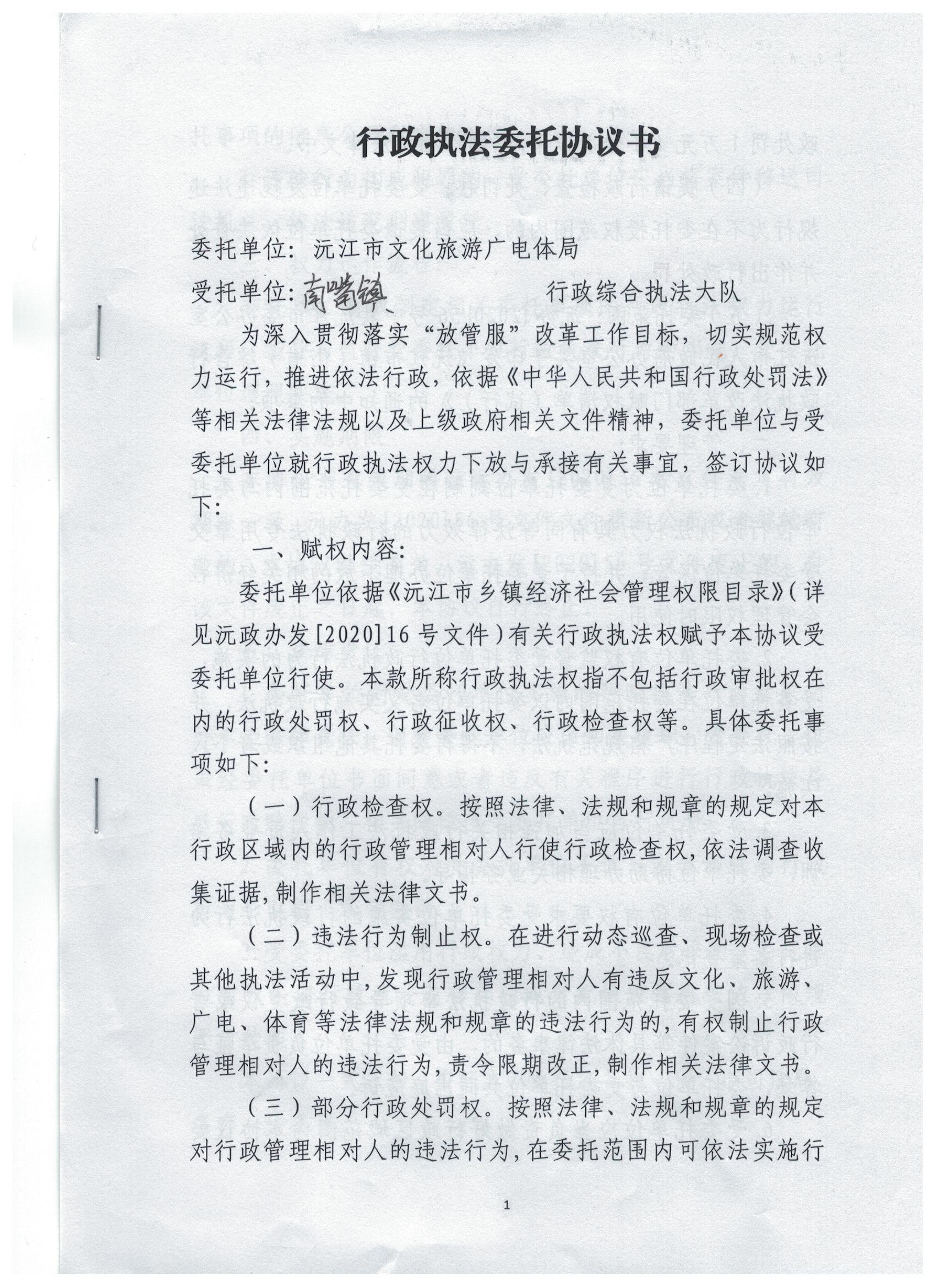 南嘴镇与市文化旅游广电体局签订《行政执法委托协议书》