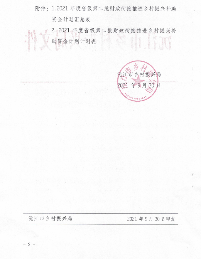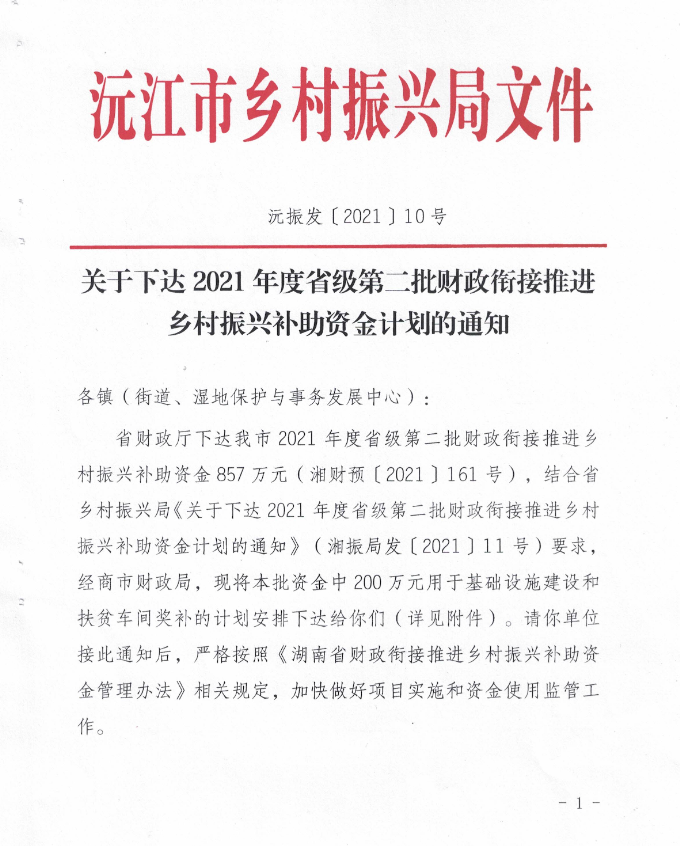 关于下达2021年度省级第二批财政衔接推进乡村振兴补助资金计划的通知(沅振发〔2021〕10号 )
