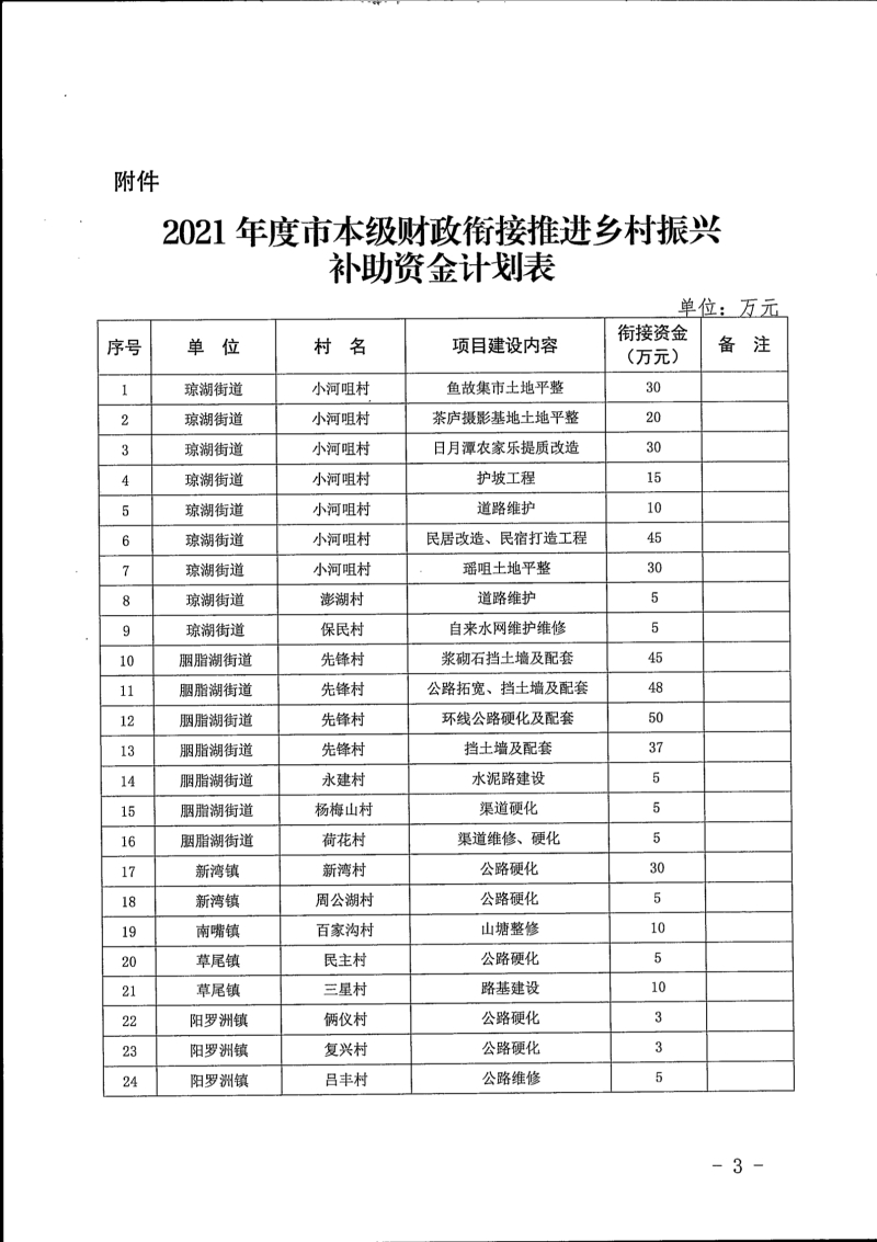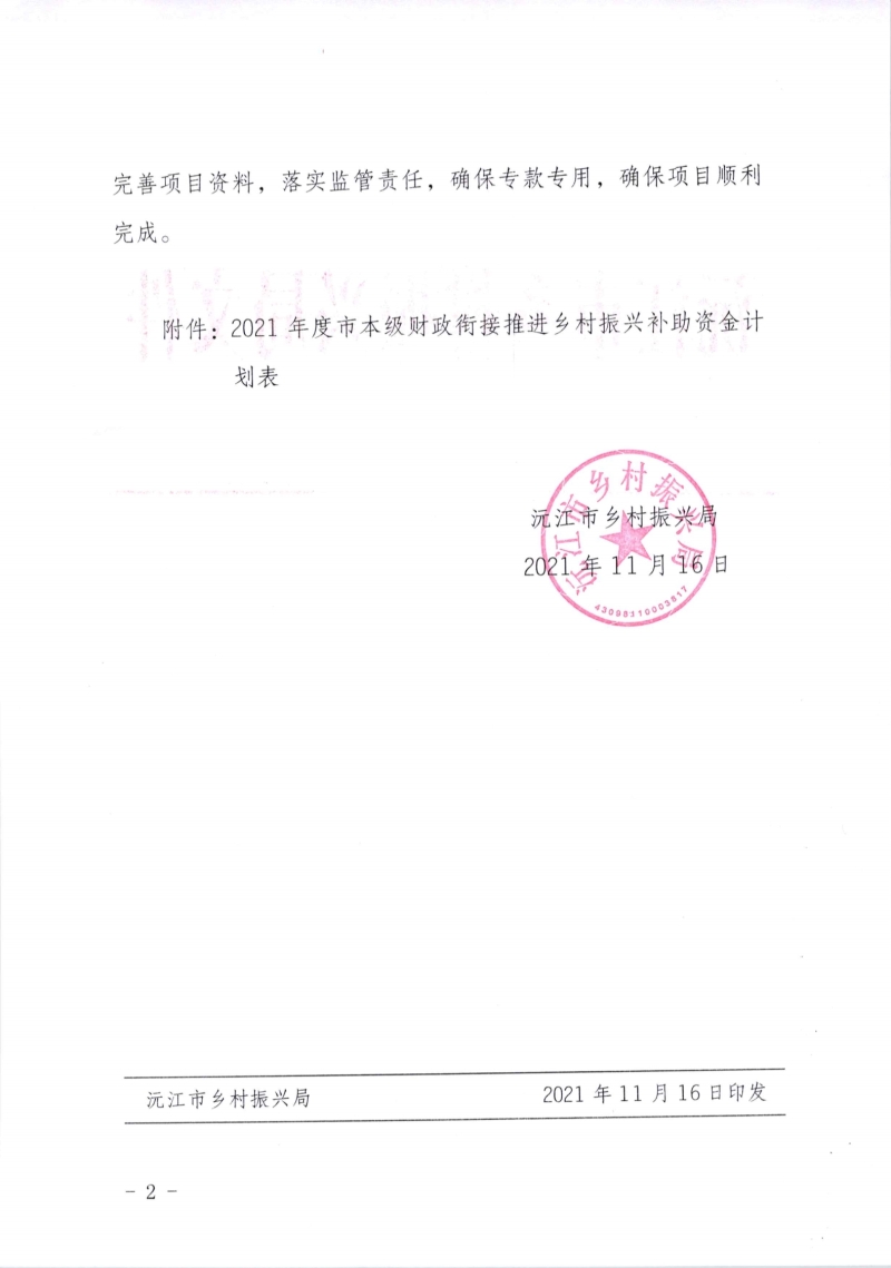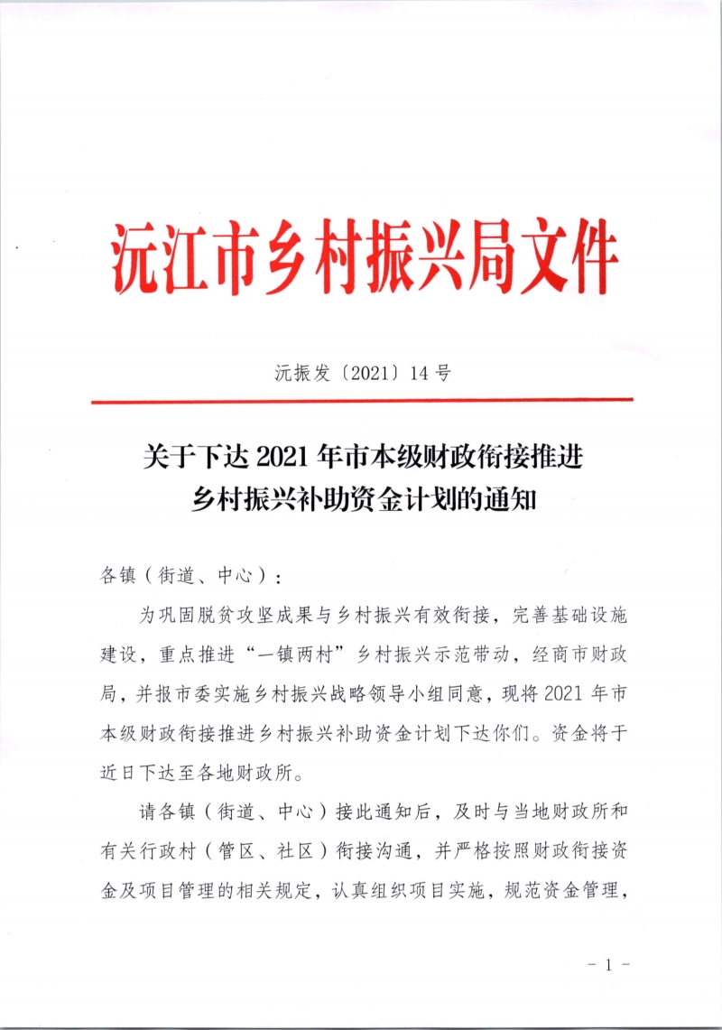 关于下达2021年市本级财政衔接推进乡村振兴补助资金计划的通知(沅振发〔2021〕14号)