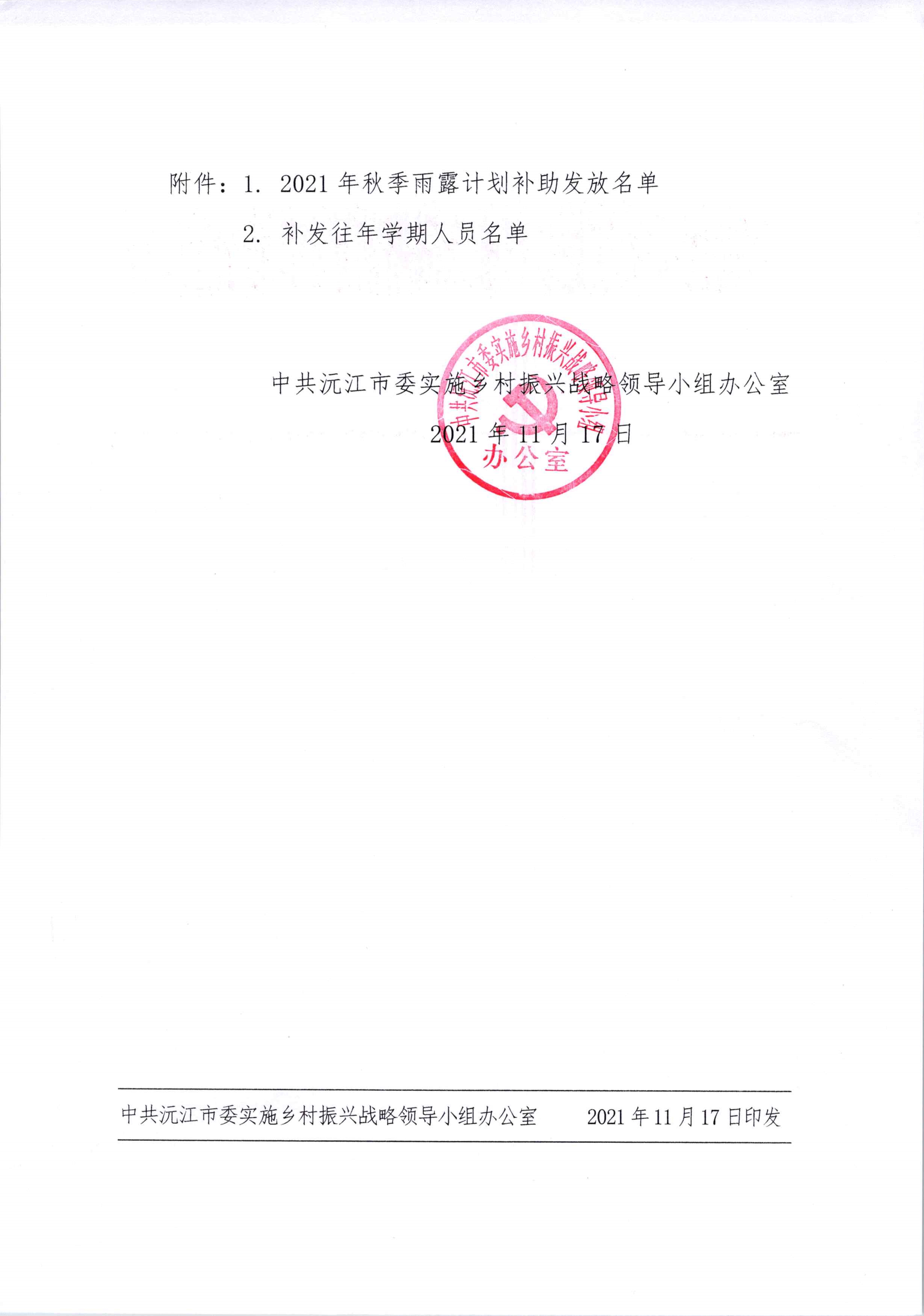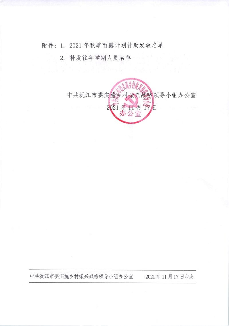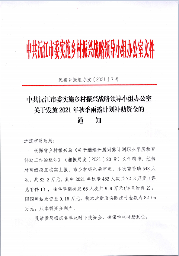 关于发放2021年秋季雨露计划补助资金的通知(沅委乡振组办发〔2021〕7号)
