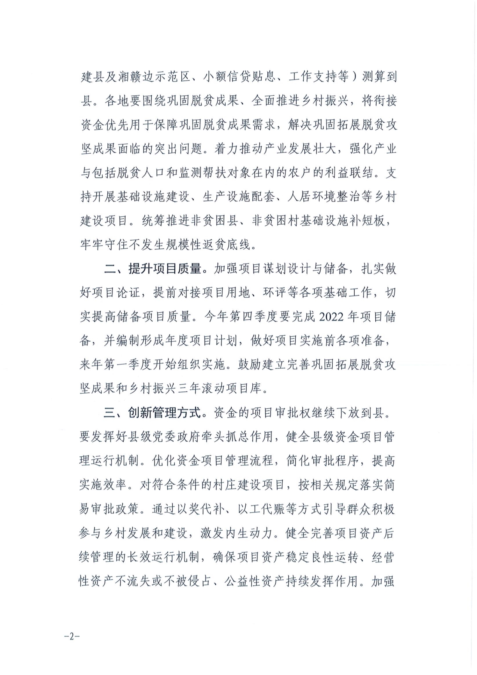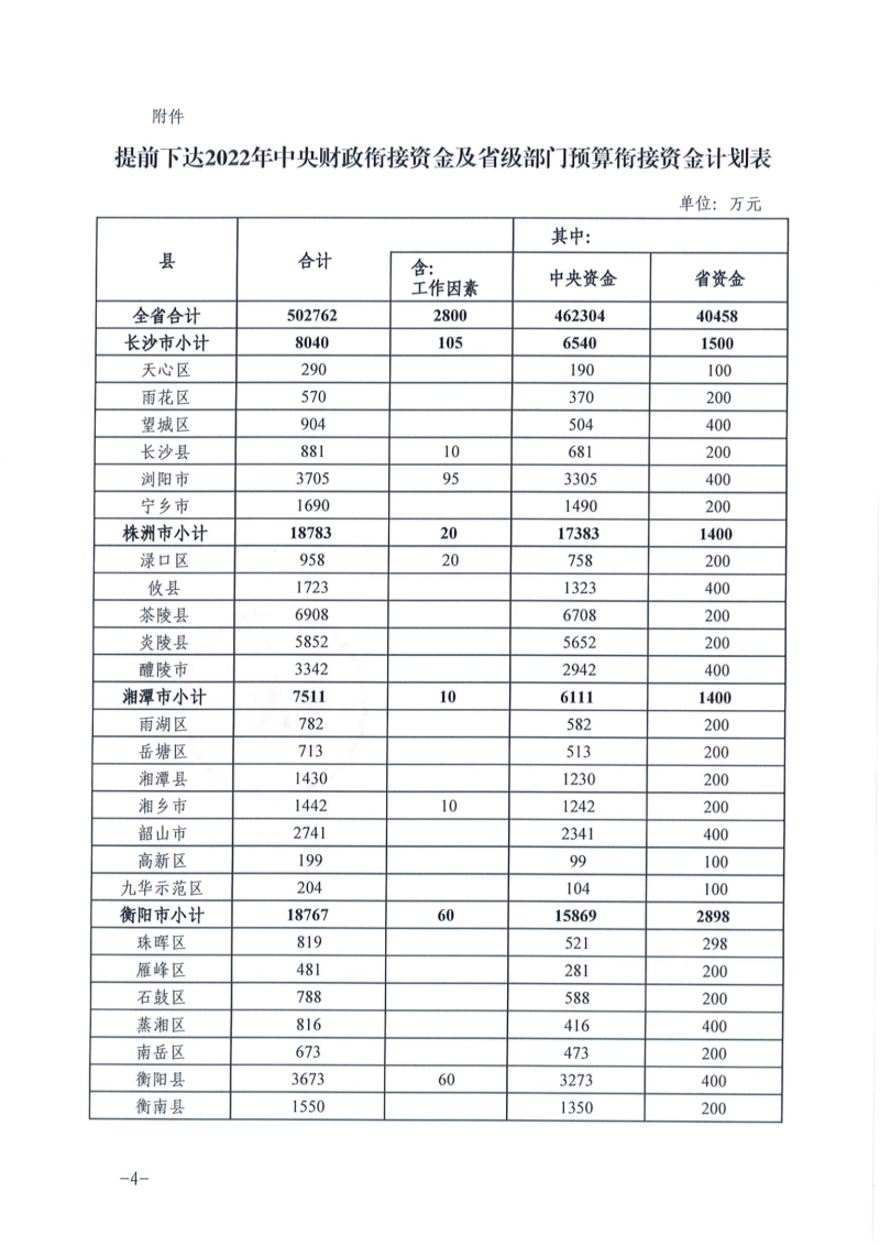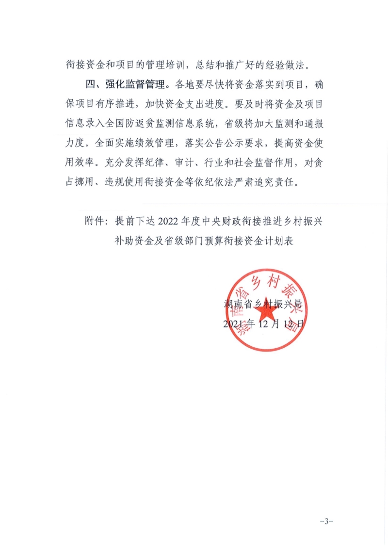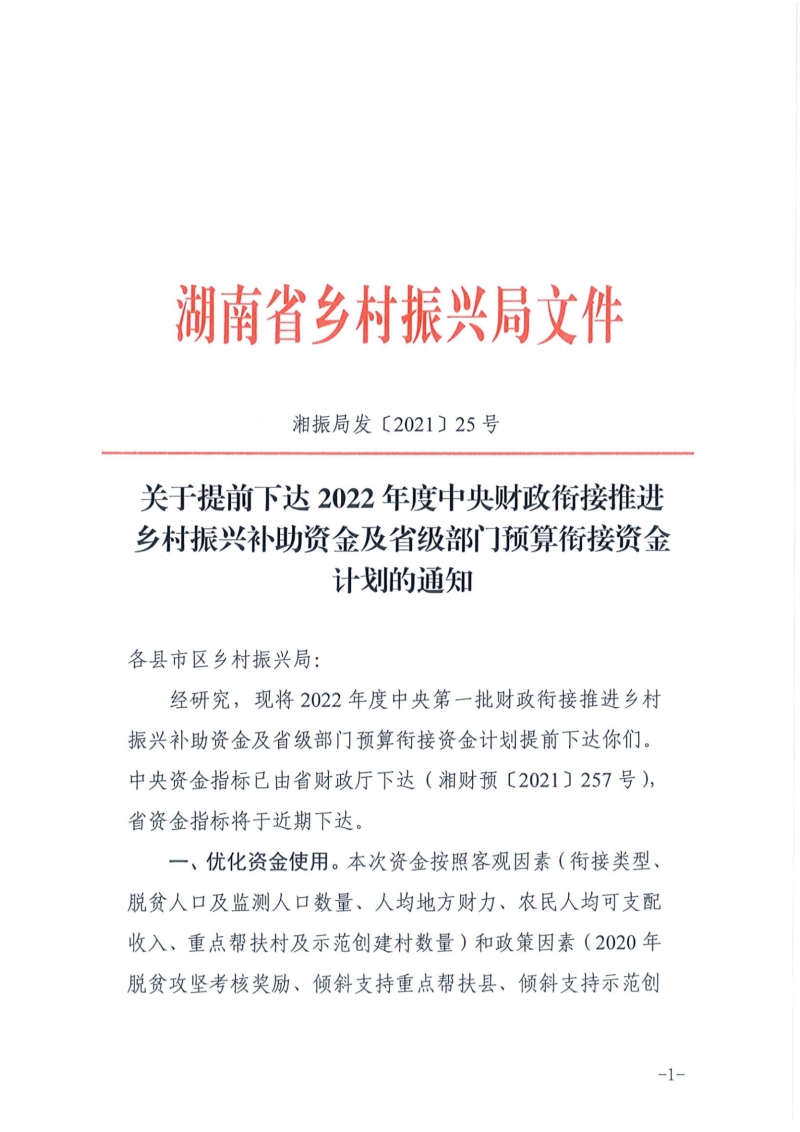 关于提前下达2022年度中央财政衔接推进乡村振兴补助资金及省级部门预算衔接资金计划的通知(湘振局发〔2021〕25号)