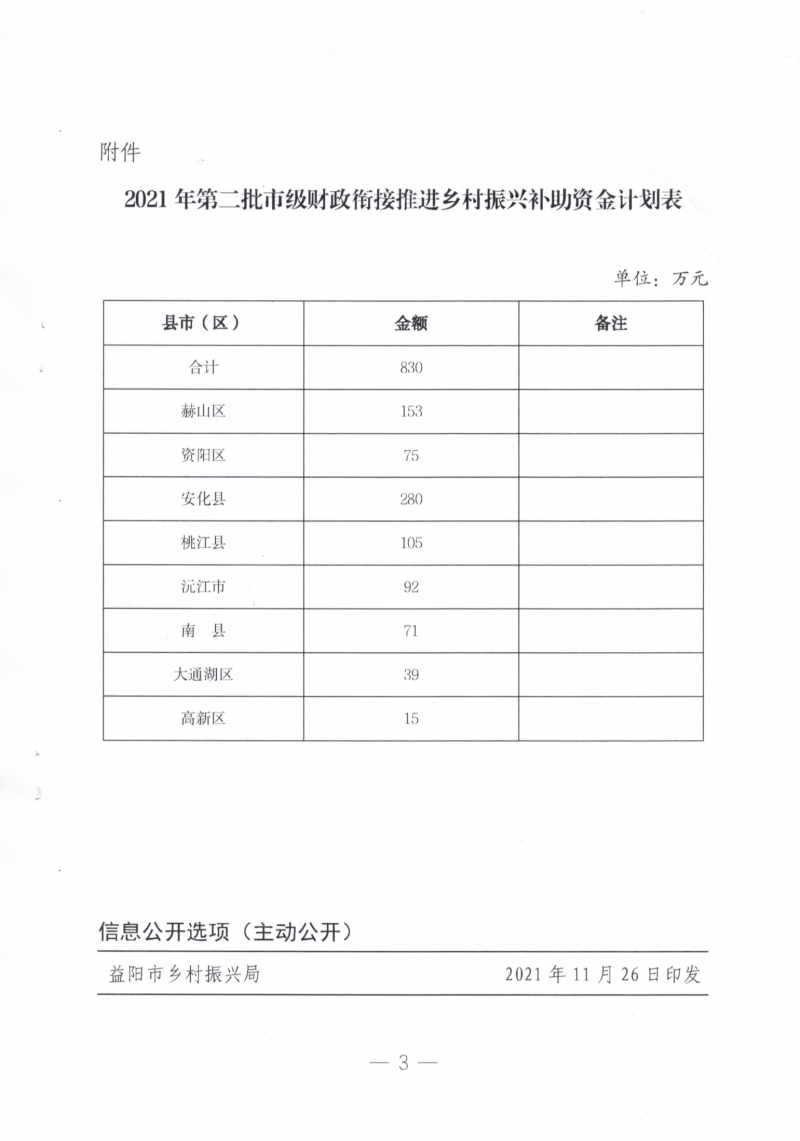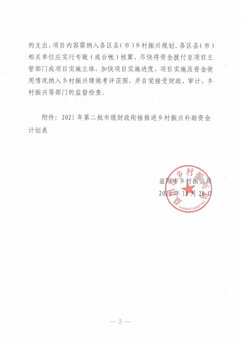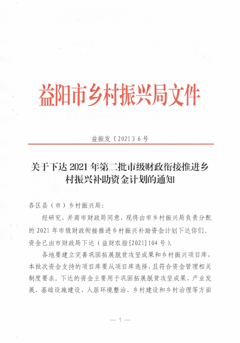 关于下达2021年第二批市级财政衔接推进乡村振兴补助资金计划的通知(益振发〔2021〕6号)
