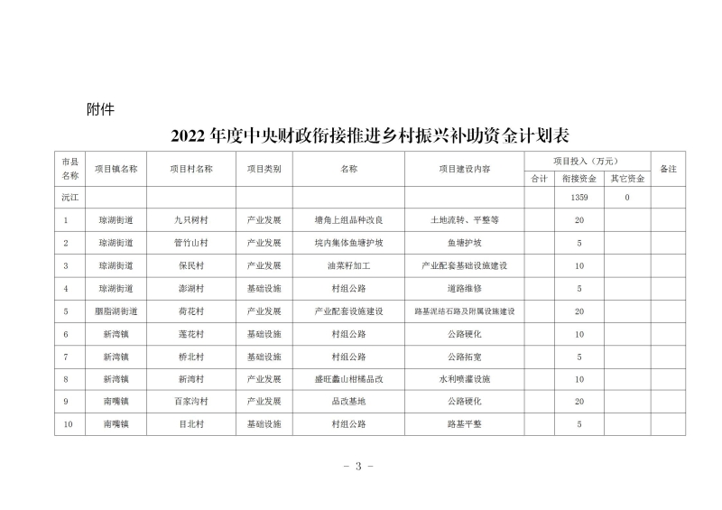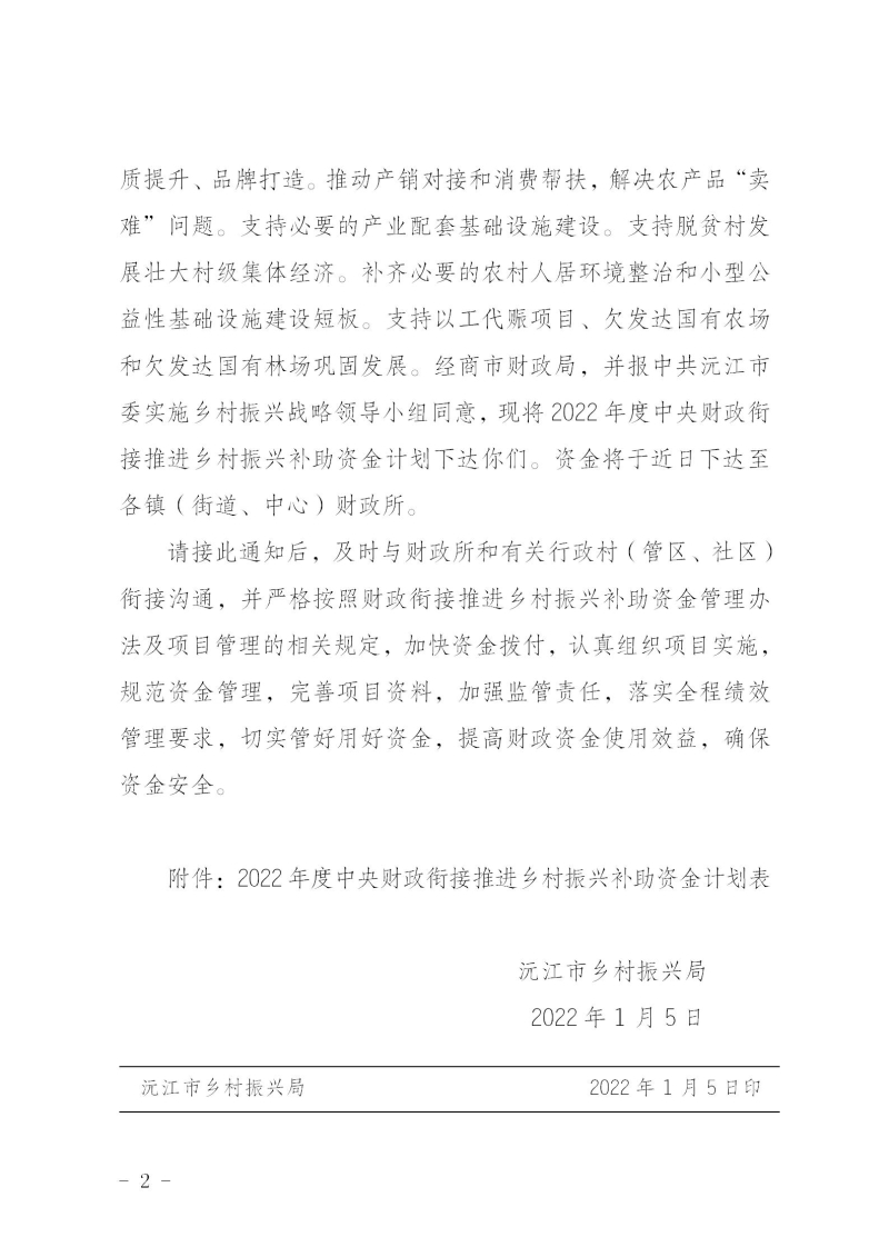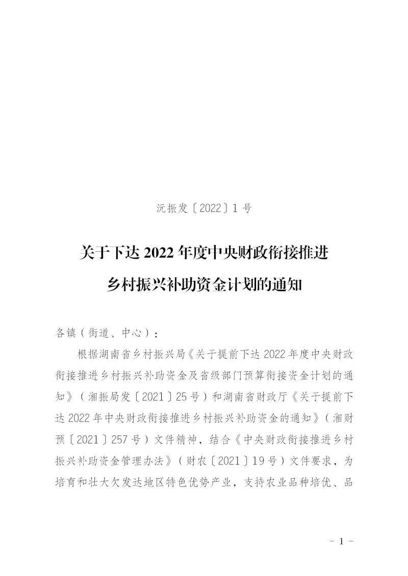 关于下达2022年度中央财政衔接推进 乡村振兴补助资金计划的通知(沅振发〔2022〕1号)
