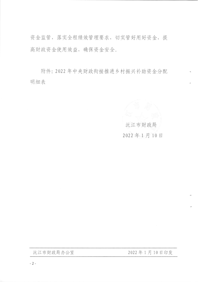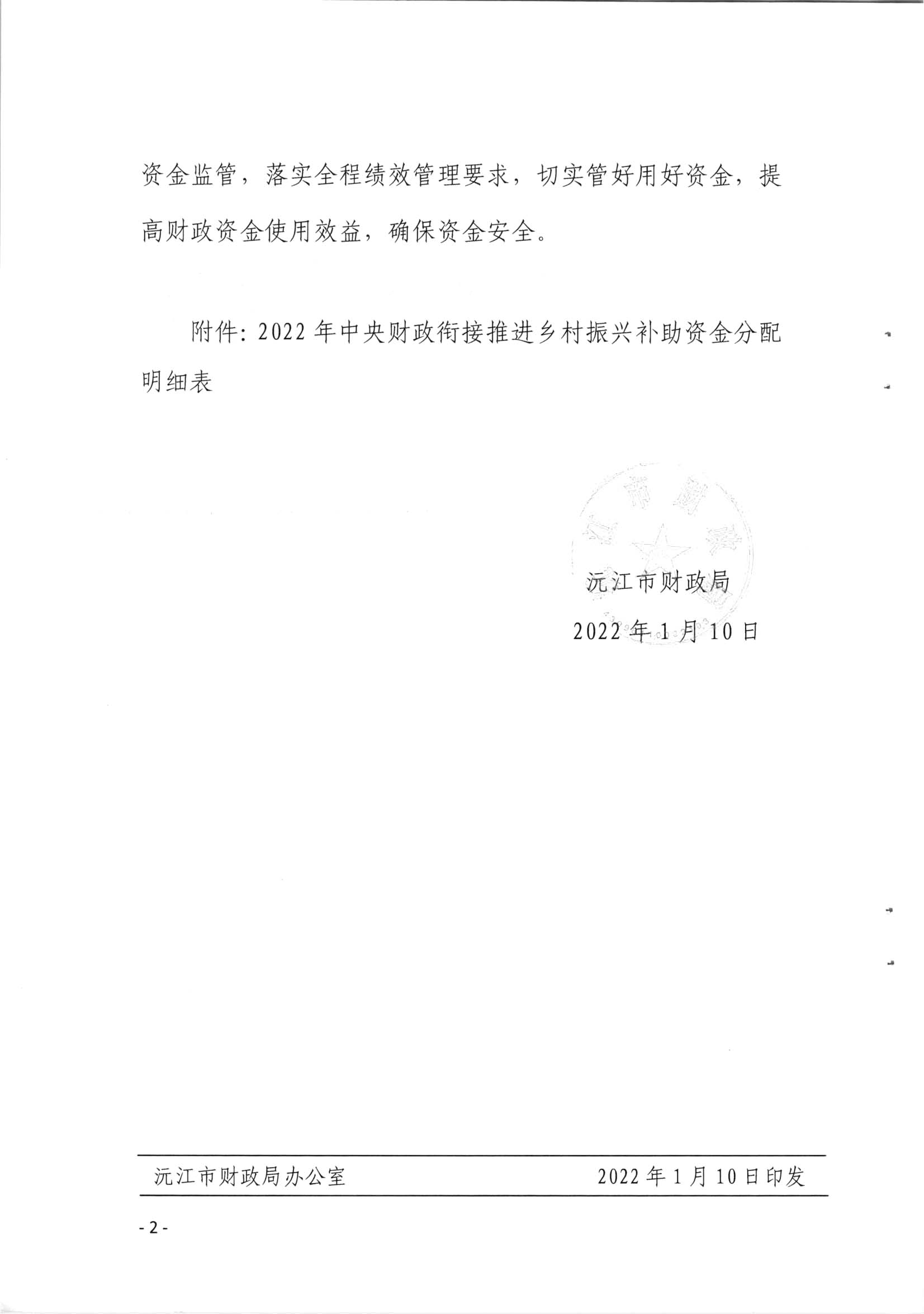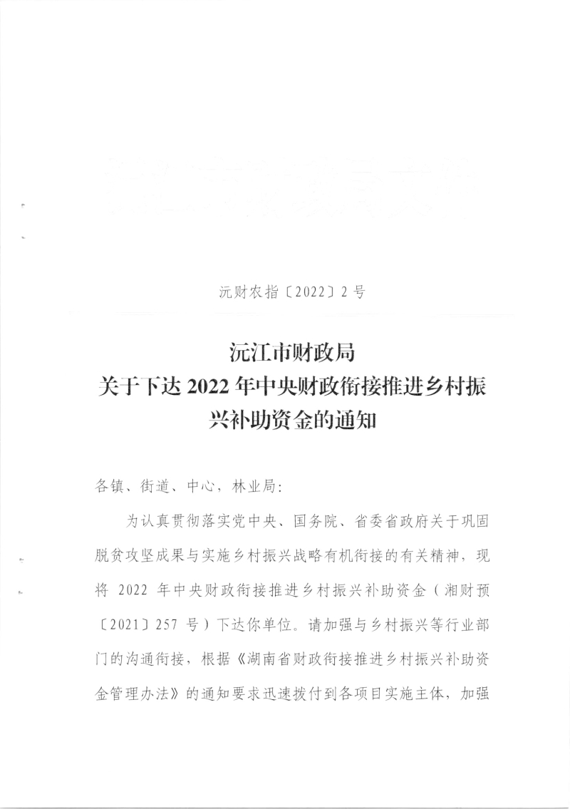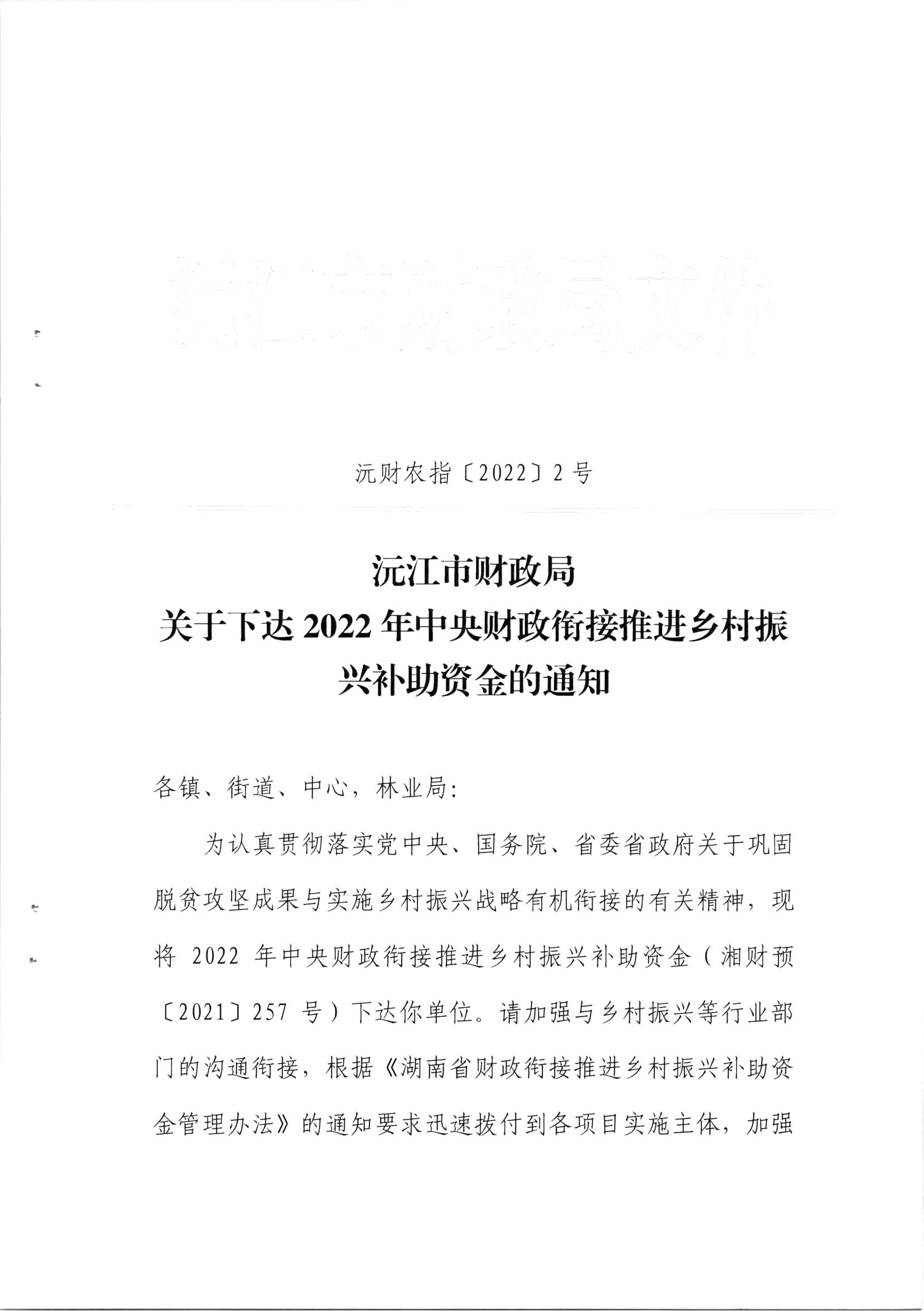 沅财农指〔2022〕2号关于下达2022年中央财政衔接推进乡村振兴补助资金的通知