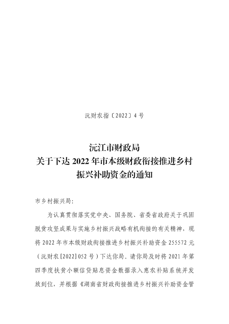 沅财农指〔2022〕4号 沅江市财政局关于下达2022年市本级财政衔接推进乡村振兴补助资金的通知.pdf