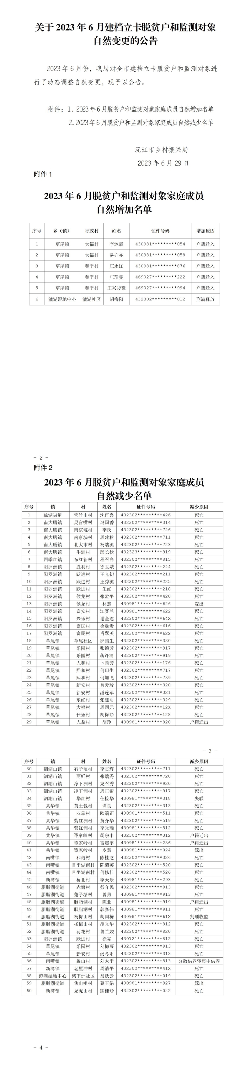 关于2023年建档立卡脱贫户对象和监测户对象自然变更的公告(6月份)