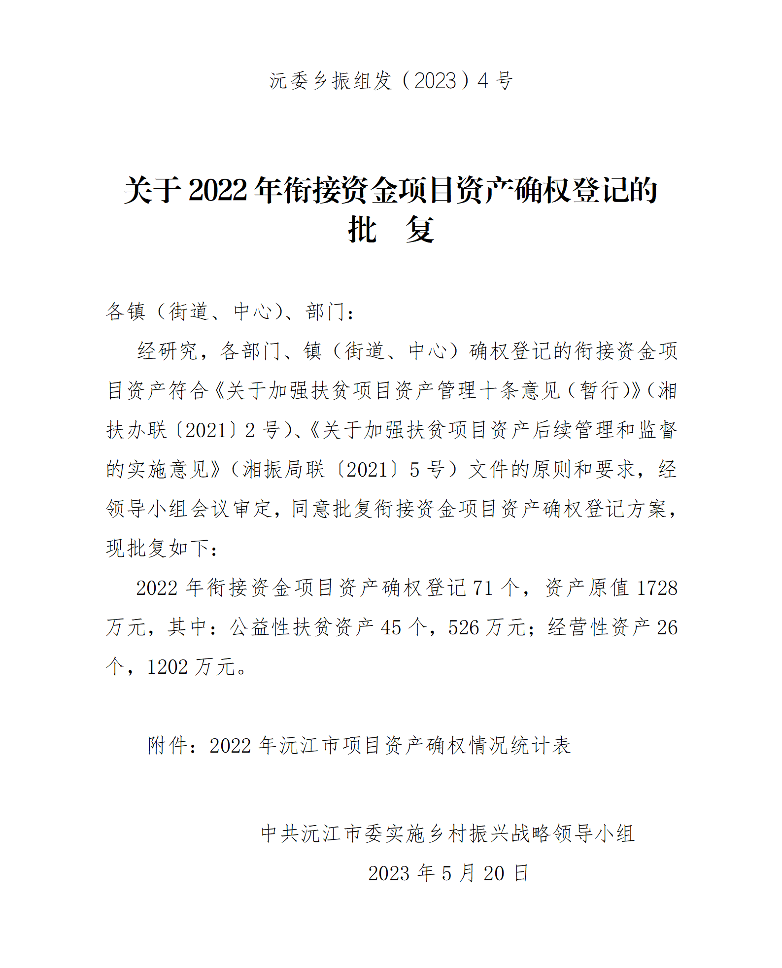 沅委乡振组发(2023)4号关于2022年衔接资金项目资产确权登记的批复
