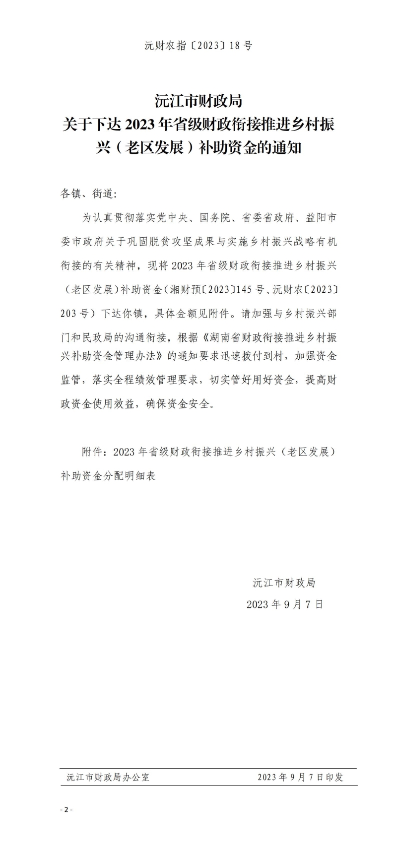 沅财农指〔2023〕18号 沅江市财政局 关于下达2023年省级财政衔接推进乡村振兴(老区发展)补助资金的通知