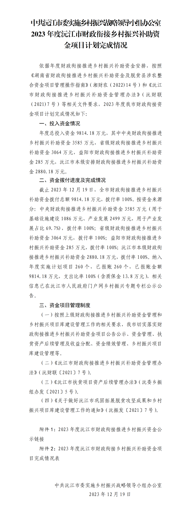 中共沅江市委实施乡村振兴战略领导小组办公室2023年度沅江市财政衔接乡村振兴补助资金项目计划完成情况