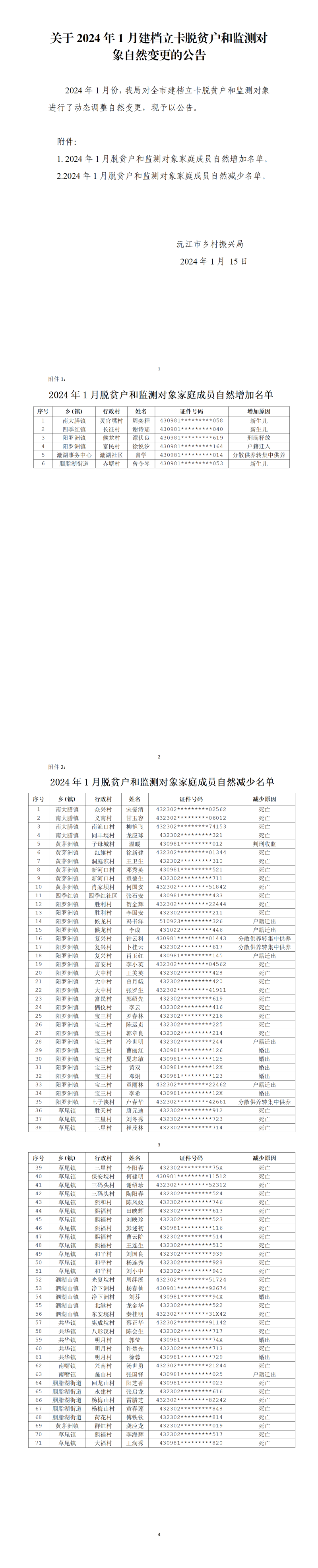 关于2024年1月建档立卡脱贫户和监测对象自然变更的公告