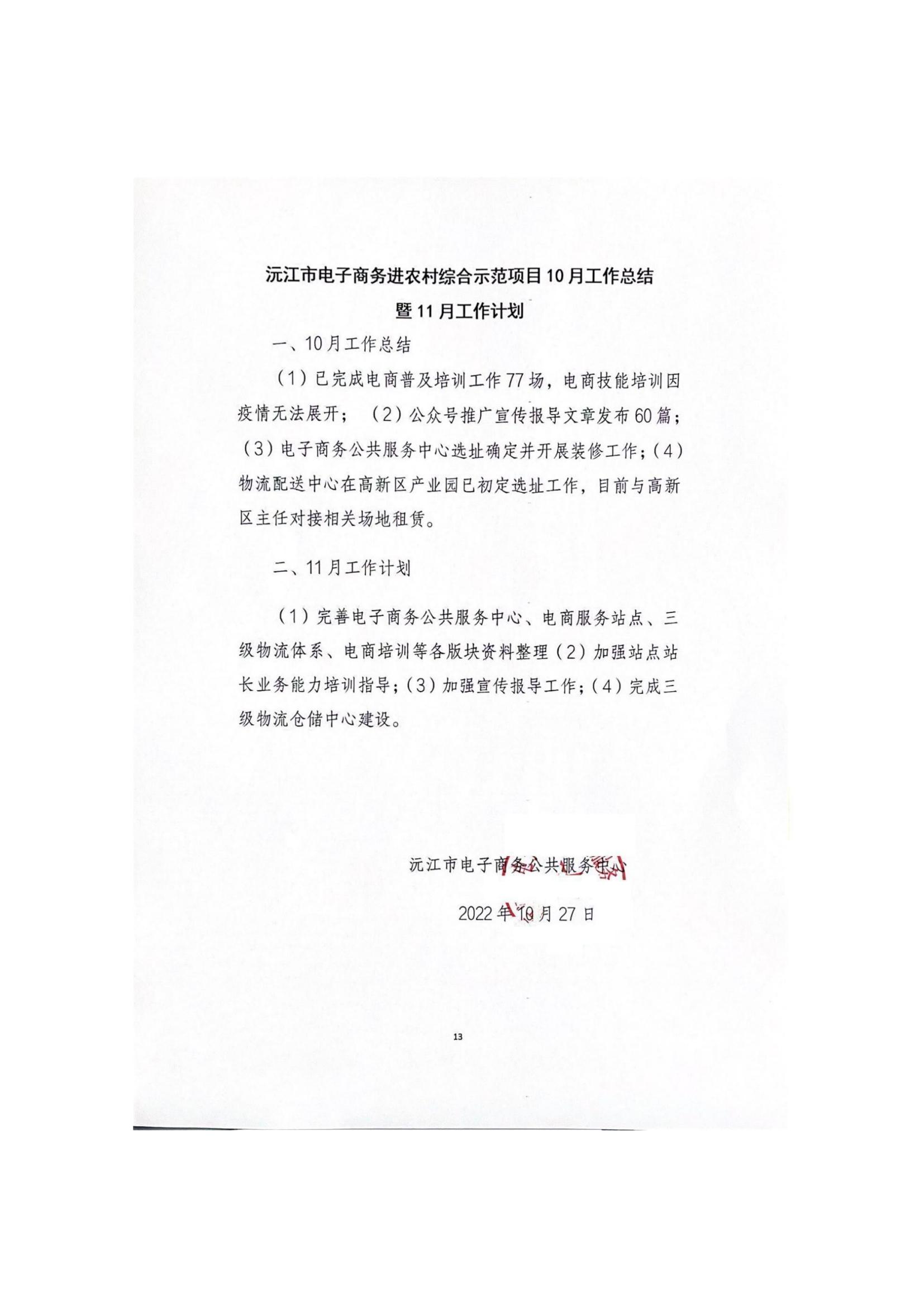 沅江市电子商务进农村综合示范项目10月工作总结暨11月工作计划