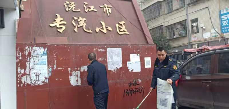 12月9日,在沅江市区专汽小区门口几位城管执法人员正在对门前乱贴乱画的小广告进行清理,一位执法人员用喷水壶对张贴处进行喷洒、浸润;另一位执法人员飞舞着铁铲对张贴纸进行清理,由于张贴得十分牢靠,执法人员通过反复刮擦,才将一处乱张贴清理干净。