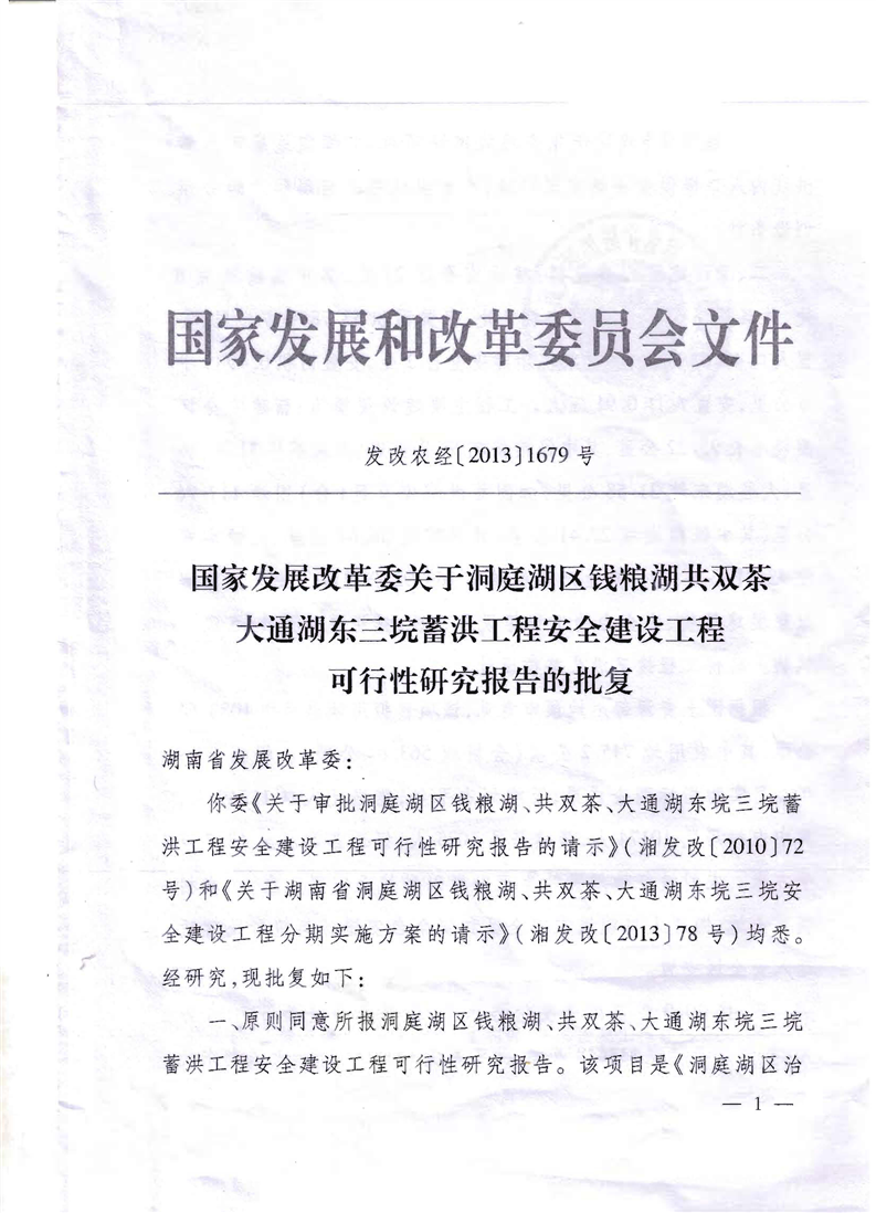 发改农经【2013】1679号三垸安全建设工程可研批复