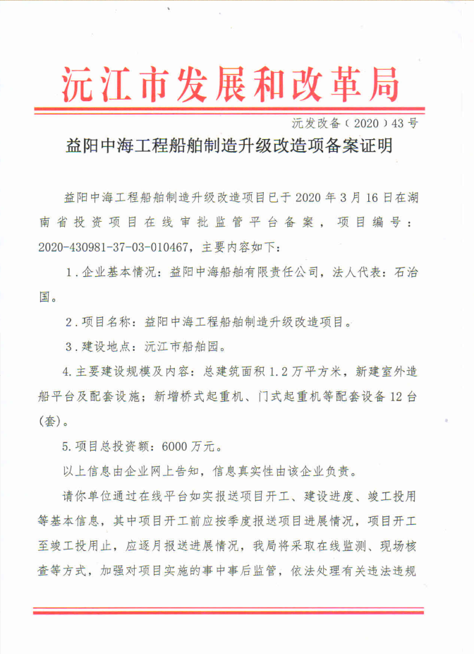 益阳中海工程船舶制造升级改造项备案证明