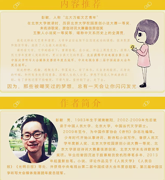 彭敏,人称“北大万能文艺青年”,在北京大学就读时,历获北京大学校园原创小说大赛一等奖、原创诗词大赛zui佳原创奖、未名诗歌奖、王默人小说奖一等奖等,堪称中文系历史上的全满贯。