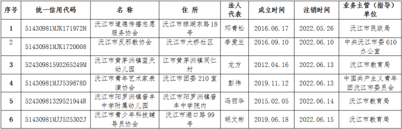 根据《社会团体登记管理条例》和《民办非企业单位登记管理暂行条例》规定,沅江市民政局对下列6家社会组织进行依法注销登记,被注销登记的社会组织不得再以原社会组织的名义开展任何活动。其登记证书和印章自注销登记之日起作废,特此公告。联系电话:0737-2813215