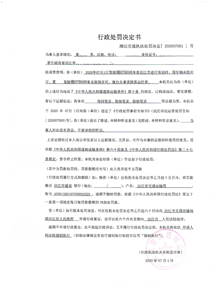 夏某某未取得营运许可擅自从事道路客运经营处罚