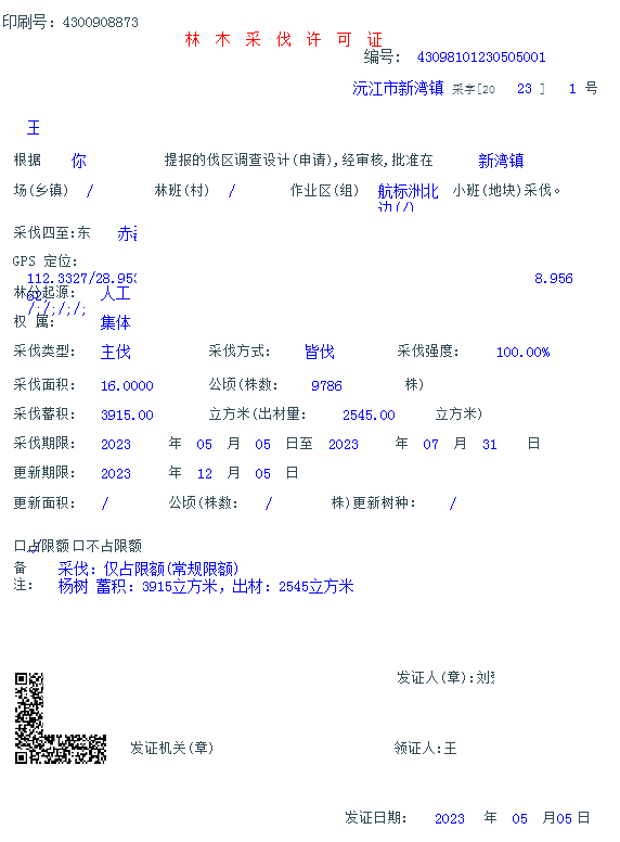 林业行政许可决定书【2023】第015号