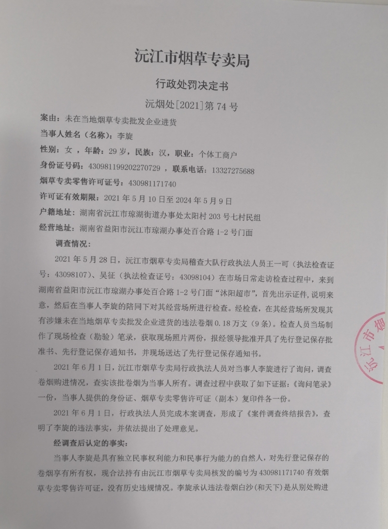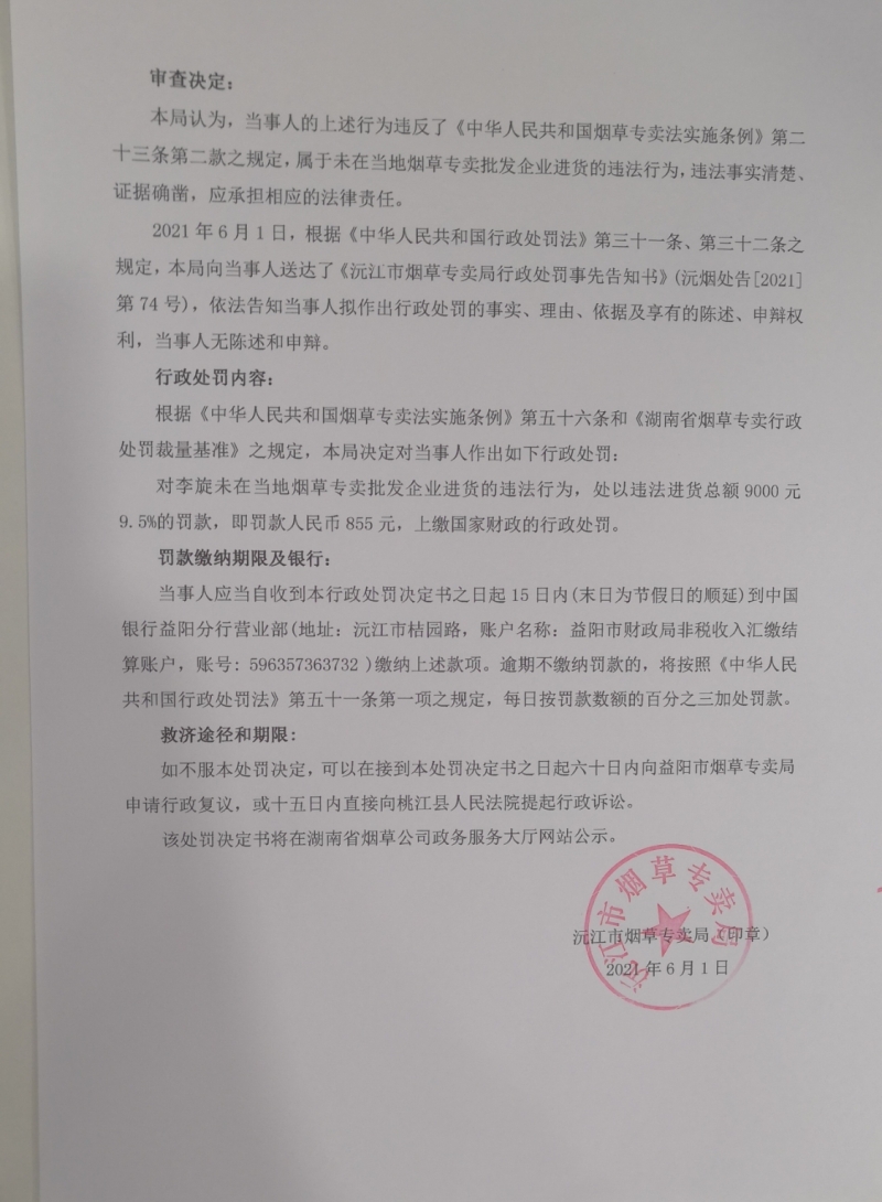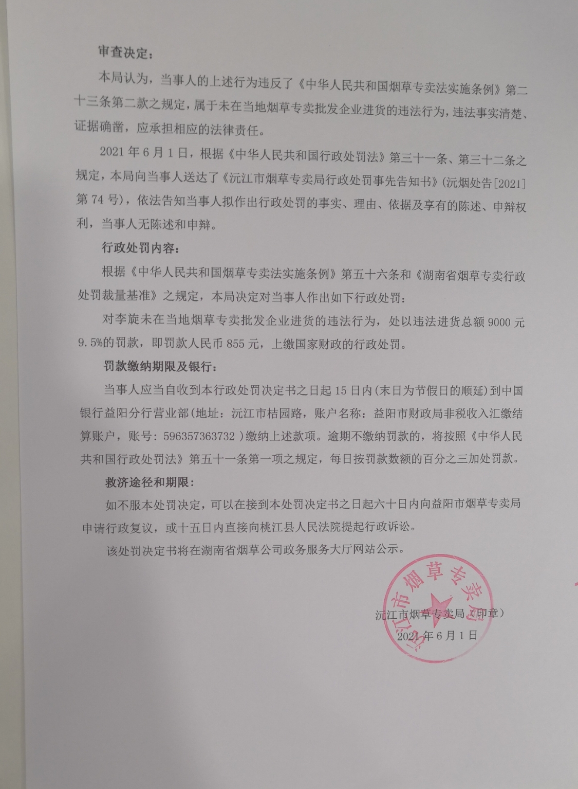 沅江市烟草专卖局行政处罚决定书沅烟处[2021]第74号