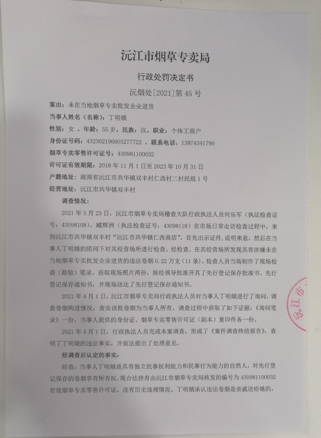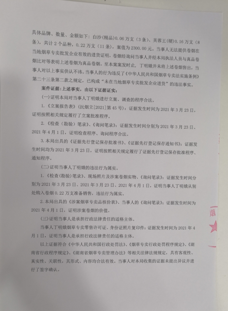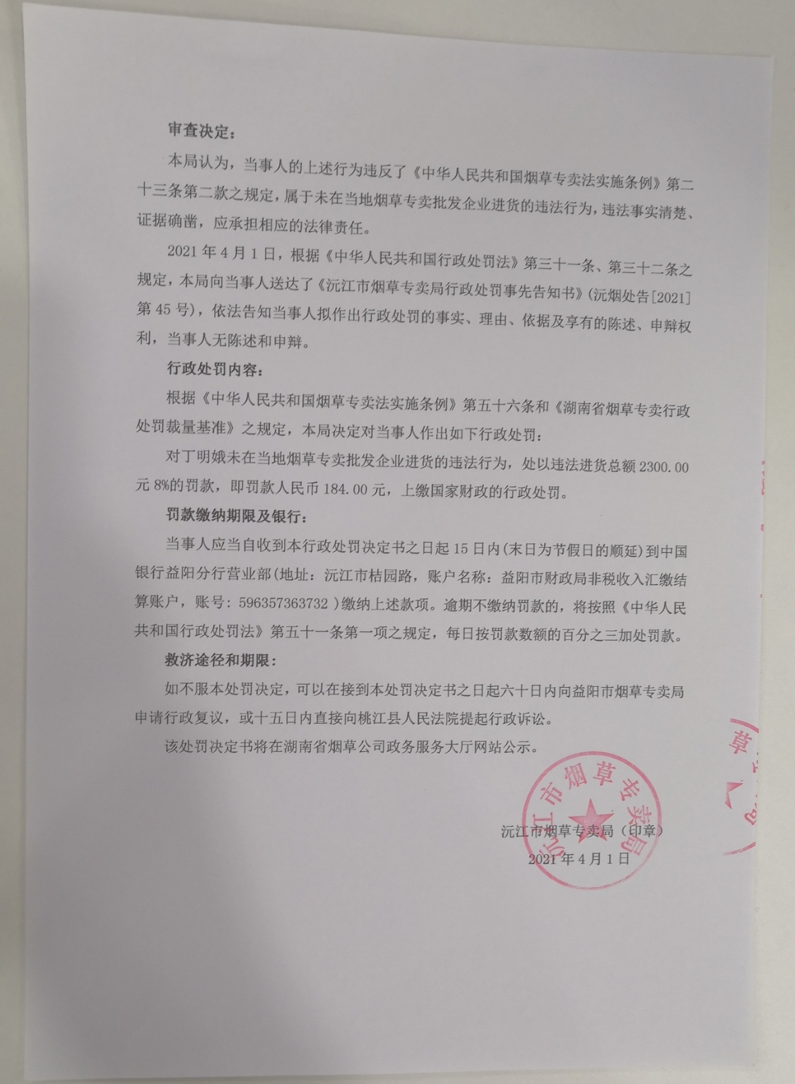 沅江市烟草专卖局行政处罚决定书沅烟处[2021]第45号