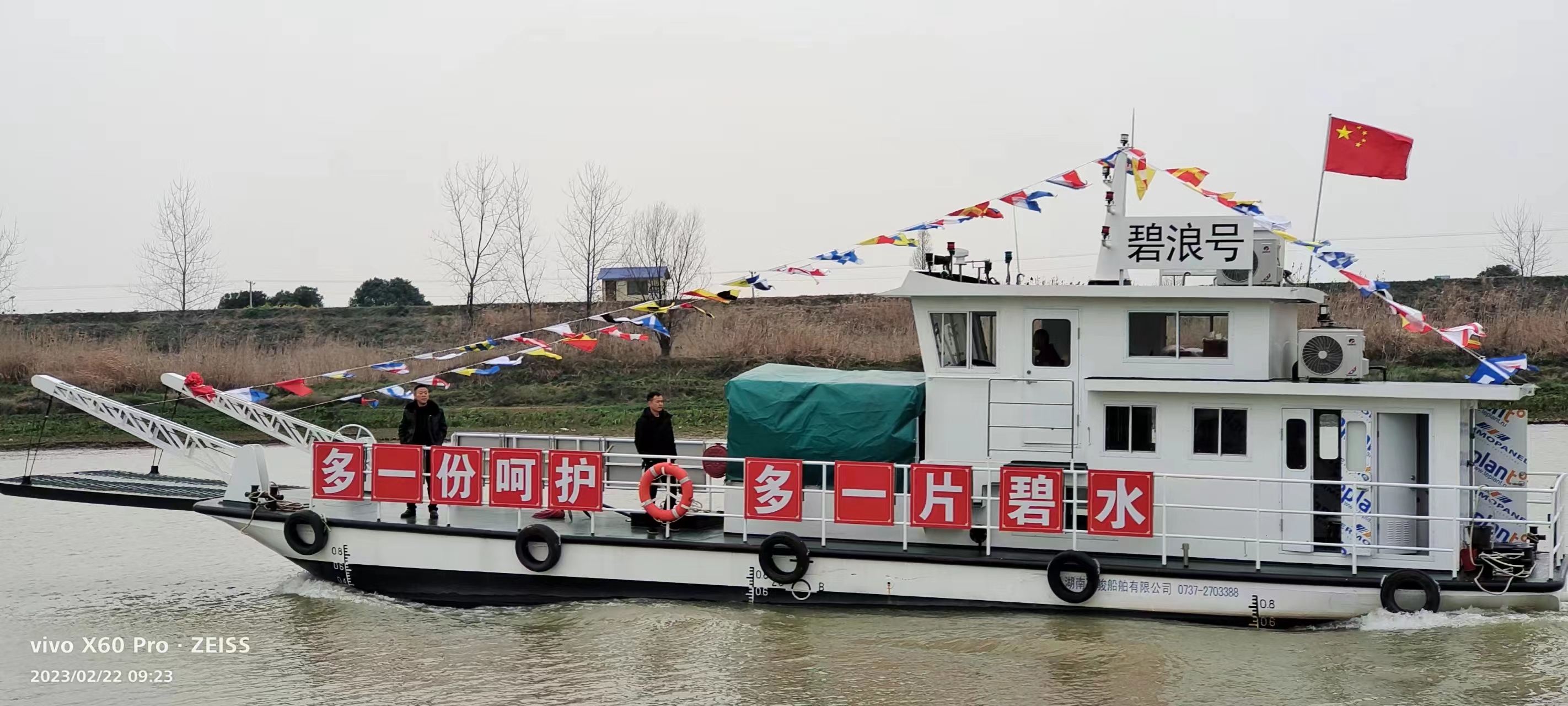 2023年2月22日9时18分,在“呜呜”的汽笛声中,耗资140余万元,由湖南万骏船泊有限公司打造的两艘河湖保洁船正驶离造船厂码头,交付河道湖泊管理站保洁办使用。这是沅江市人民政府对垸外河湖保洁经费投入加大的重要体现。