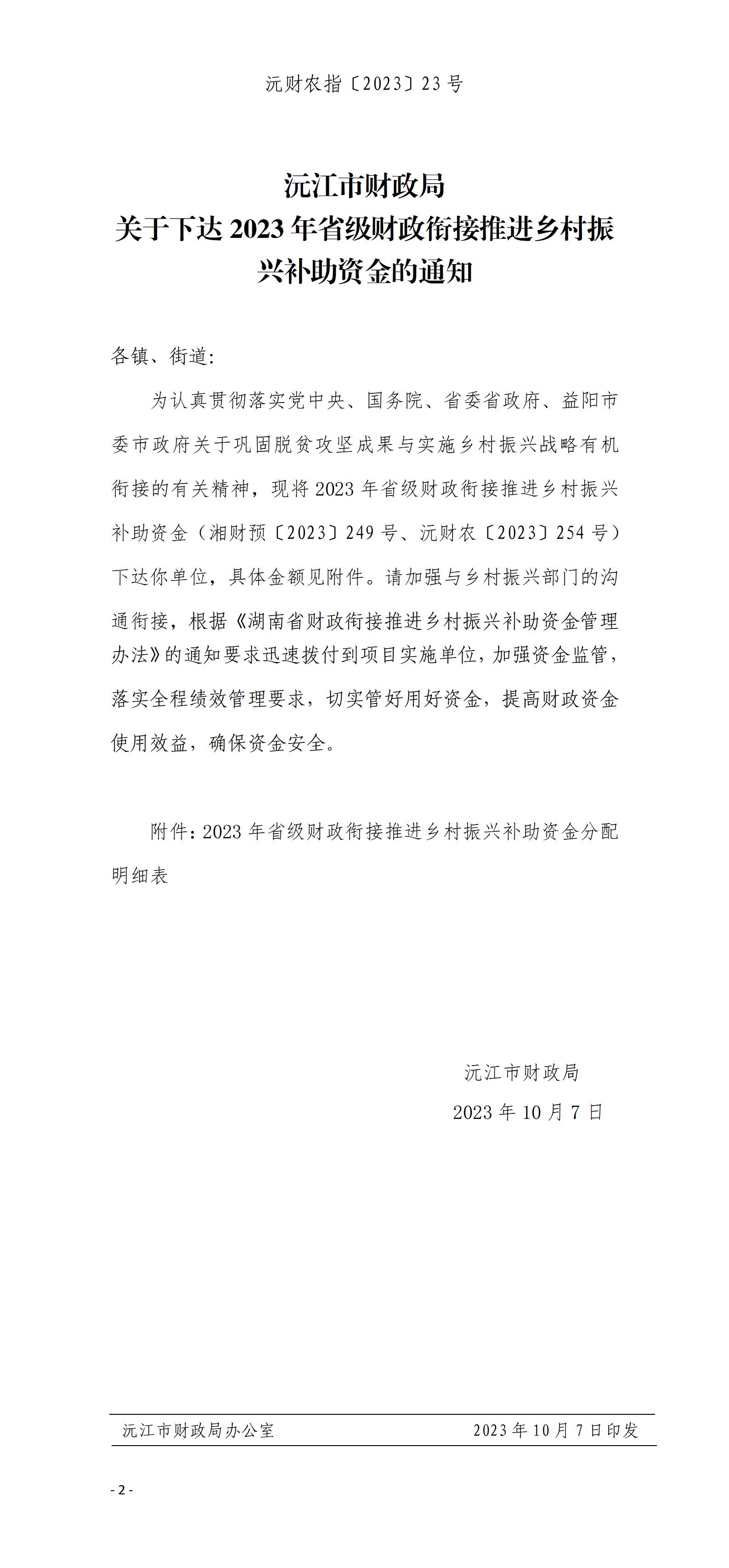 沅财农指〔2023〕23号沅江市财政局 关于下达2023年市本级财政衔接推进乡村振兴(农村人居环境整治)补助资金的通知