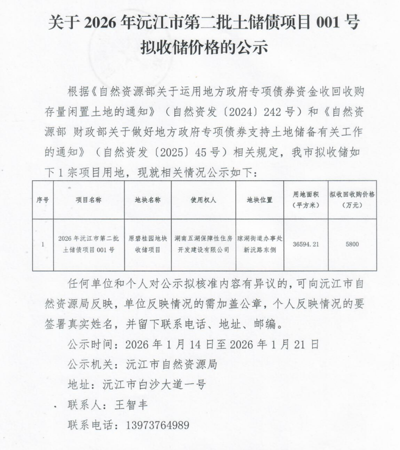 关于2026年沅江市第二批土储债项目001号拟收储价格的公示