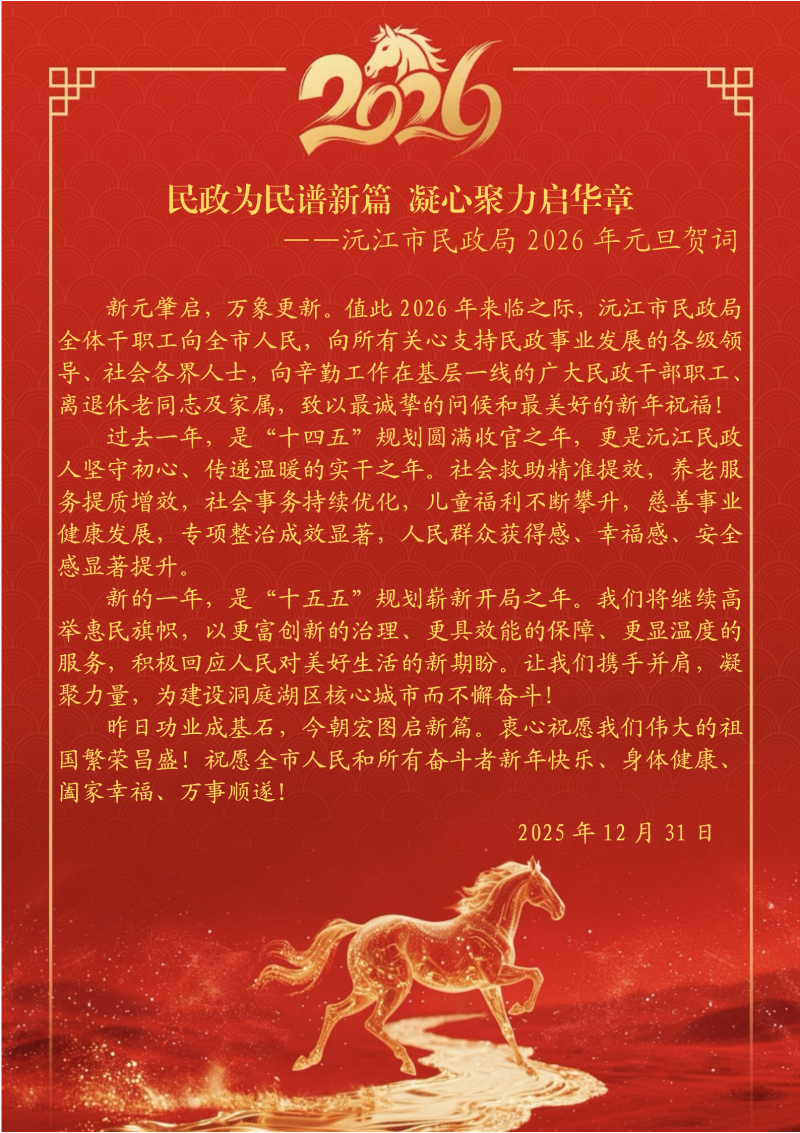 民政为民谱新篇 凝心聚力启华章——沅江市民政局2026年元旦贺词