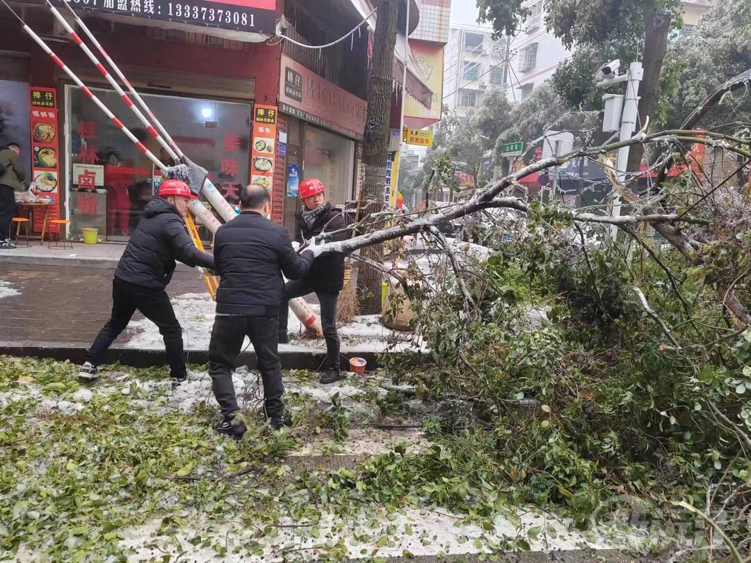 2月5日,低温雨雪冰冻天气持续,城区道路大部分行道树被压弯、断枝、倒伏,灾情严重。为避免倒伏、断枝树木对道路交通以及市民日常生活造成影响,沅江市市城管综合执法局园林绿化服务中心第一时间紧急抢救倒伏、断枝树木,排危除障保道路畅通。