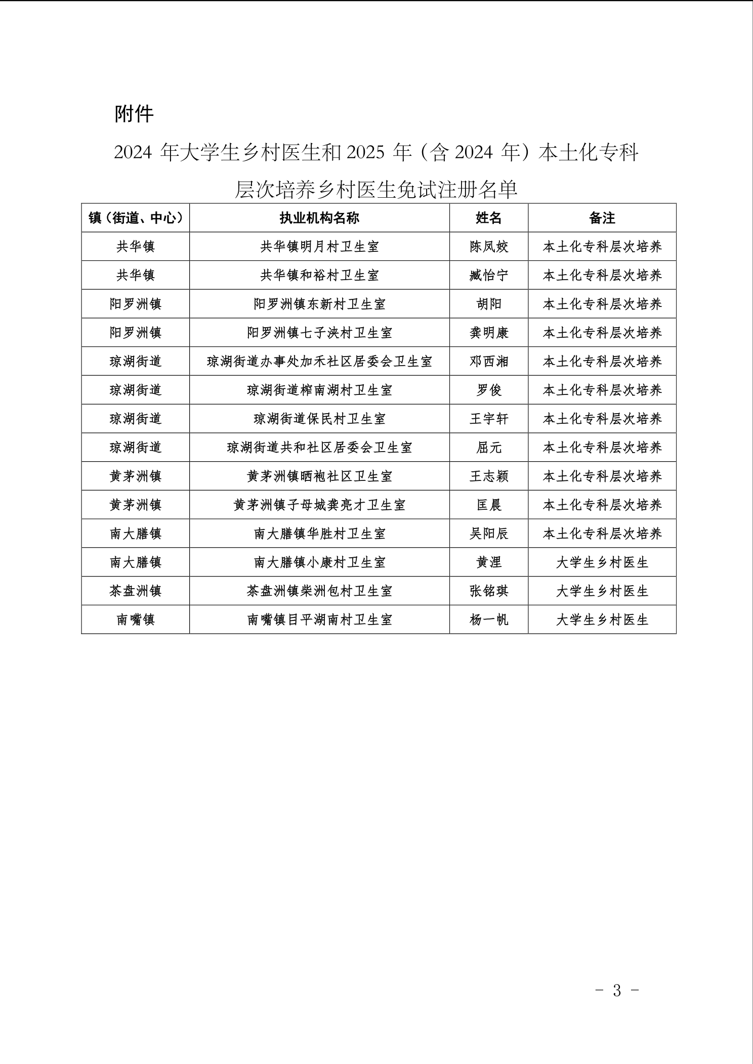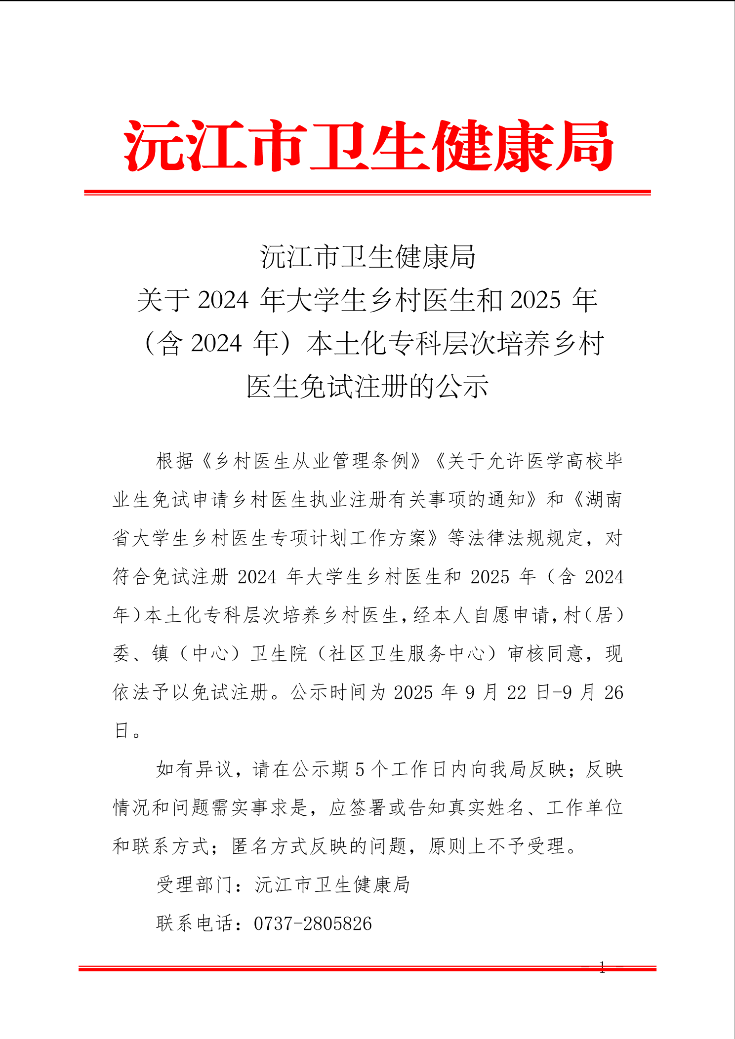 沅江市卫生健康局 关于 2024 年大学生乡村医生和 2025 年 (含 2024 年)本土化专科层次培养乡村 医生免试注册的公示