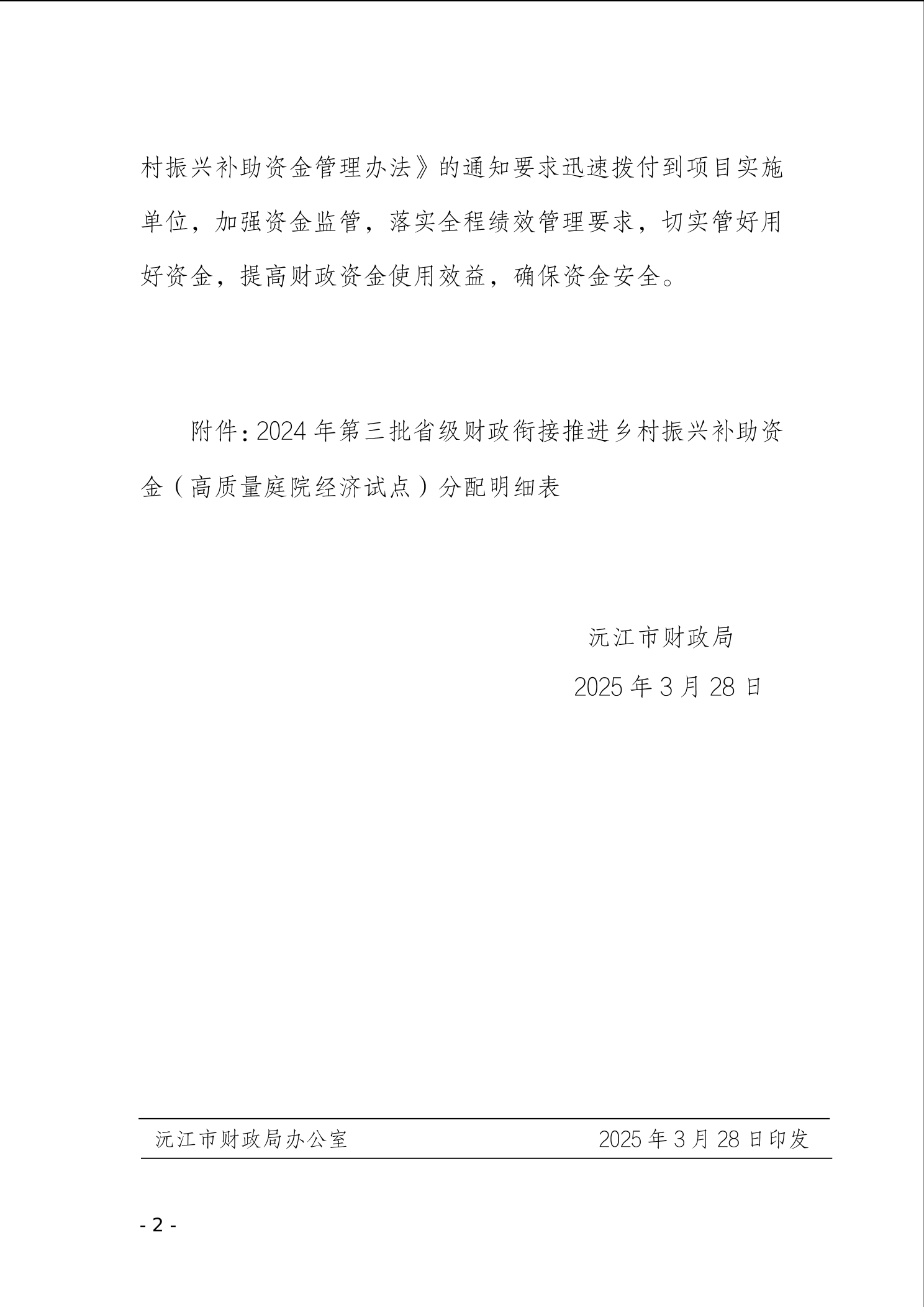 沅财农指 [2025] 1号 沅江市财政局关于下达2024年第三批省级财政衔接推进乡村振兴补助资金的通知