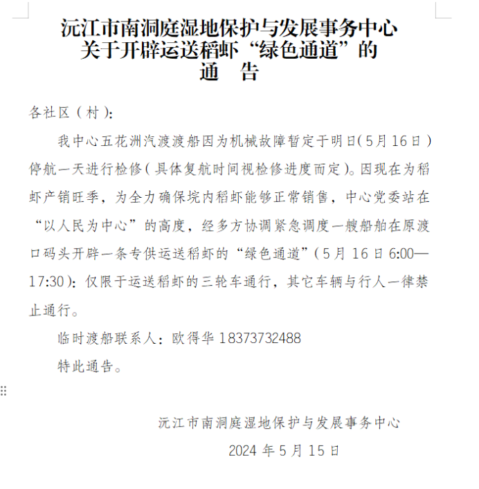 5月15日,南洞庭轮渡因故障停渡维修,维修期限不确定。南洞庭党委政府立即调派安排专渡,专供小龙虾出售出行开辟绿色通道,保障辖区内几千亩稻虾能顺利及时过河出售,减少停渡虾死亡风险,为百姓增收。