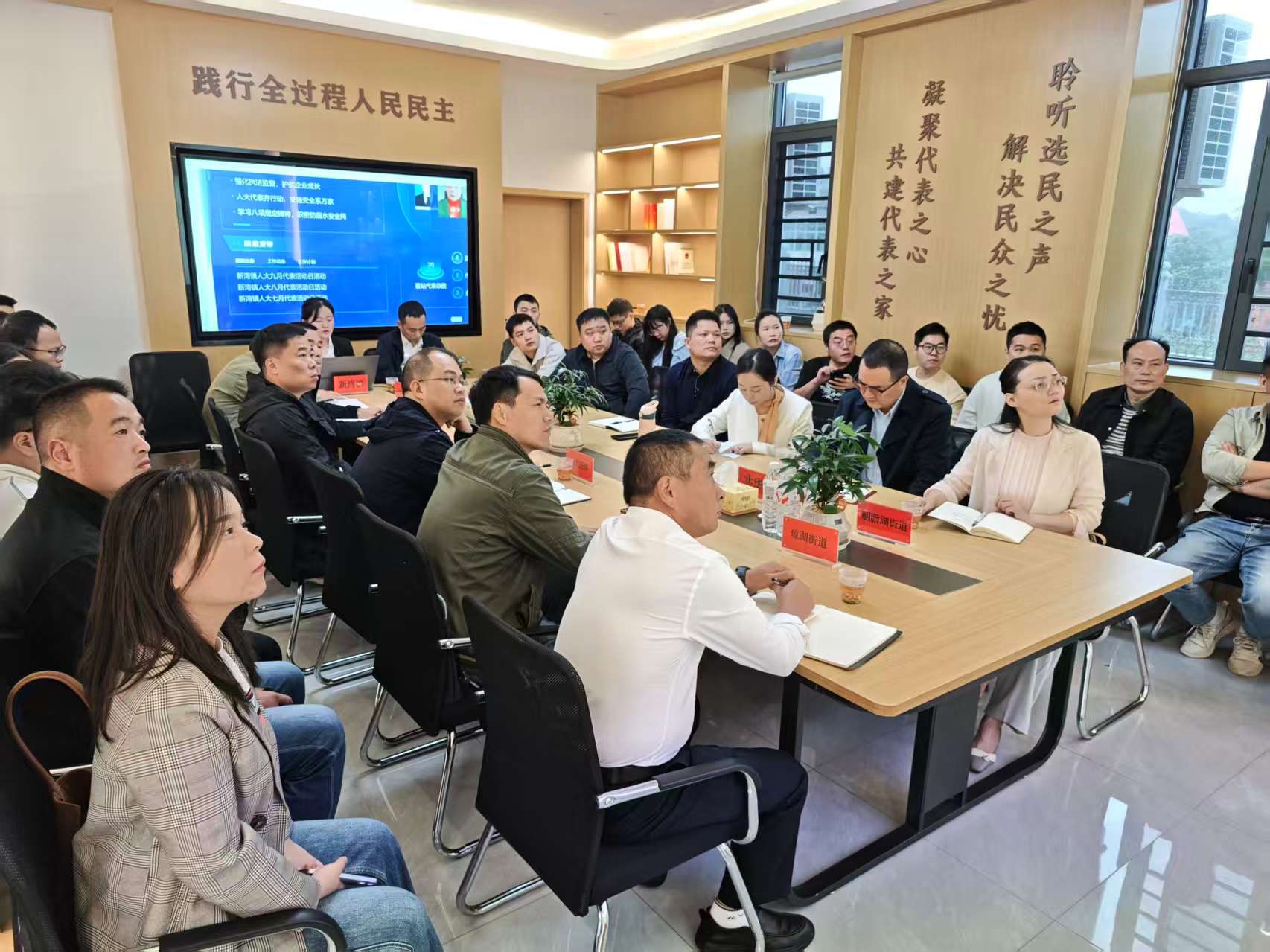 会前,参会人员在新湾镇人大“五位一体中心”议事厅观摩学习了新湾镇代表联络站工作情况,并了解了“五位一体中心”运行情况。