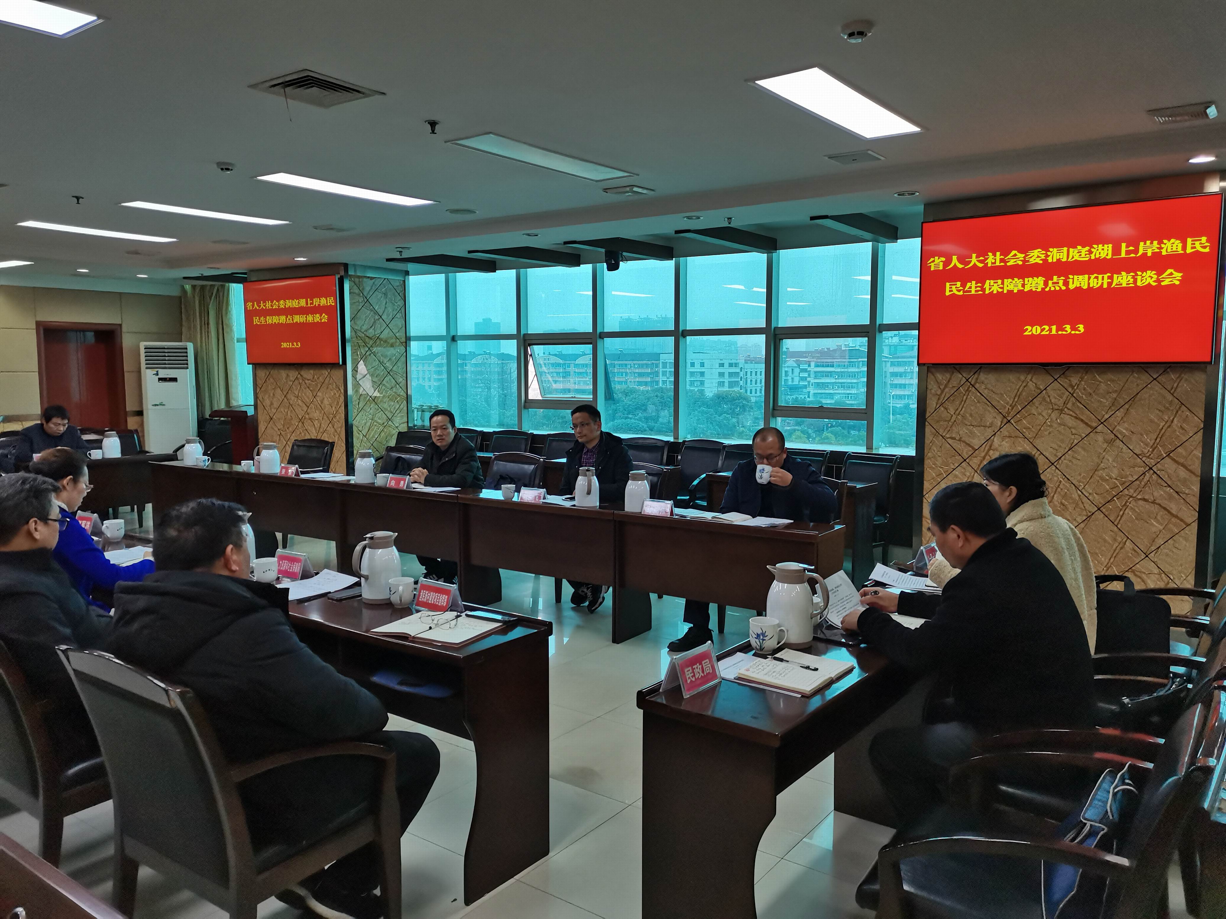3月3日上午,在沅江市人大常委会机关会议室召开省人大社会委洞庭湖上岸渔民民生保障蹲点调研座谈会。会议由益阳市人大社会委主任委员叶立飞主持,沅江市人民政府副市长邹军,市人大常委会副主任赵军洪,市政府办、人社局、“一帮一”专办等相关单位主要负责人参加。