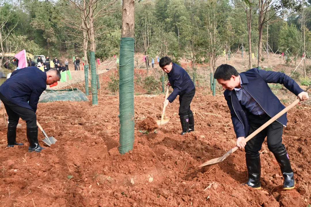 上午9时许,植树现场一派繁忙有序的劳动景象。罗必胜、廖江华、刘武等市领导与干部群众一同挥锹铲土、扶苗固根、培土踩实、浇水定根,每道工序都认真细致、规范有序。大家分工协作、默契配合、干劲十足,经过一番辛勤劳作,银杏、金丝楠木等80株苗木整齐伫立、迎风舒展,在春日暖阳中焕发出勃勃生机,为龙虎山林场增添了一道清新靓丽的绿色风景线。