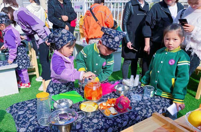 茶艺区,大班的孩子们头戴茶艺帽立在一边,有模有样地斟起茶来。这些孩子从识茶叶、识茶具、学茶礼开始,将制作茶、招待客、品尝茶一系列生活技能娴熟地在“掌中开花”,引得观摩群众一致叫好。