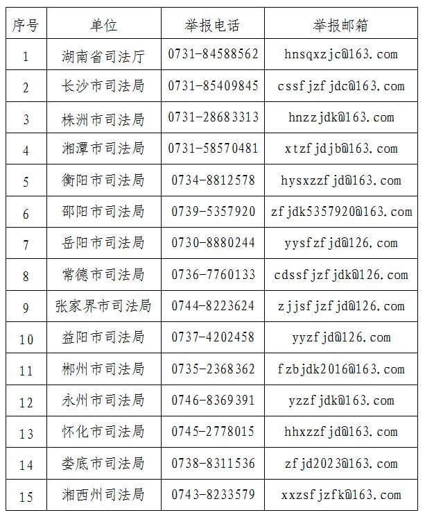 附件:1.省司法厅和各市州司法局举报邮箱、举报电话