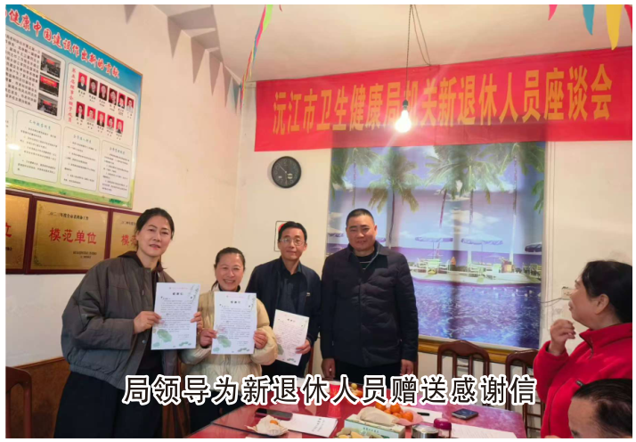 2025年12月4日,市卫生健康局为今年新退休的干部职工召开座谈会,感谢曾洞庭、肖清辉、湛 芳三位今年退休的同志,几十年来为我市卫生健康事业发展作出的贡献。