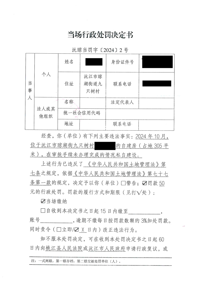 沅琼当罚字〔2024〕2号当场行政处罚决定书