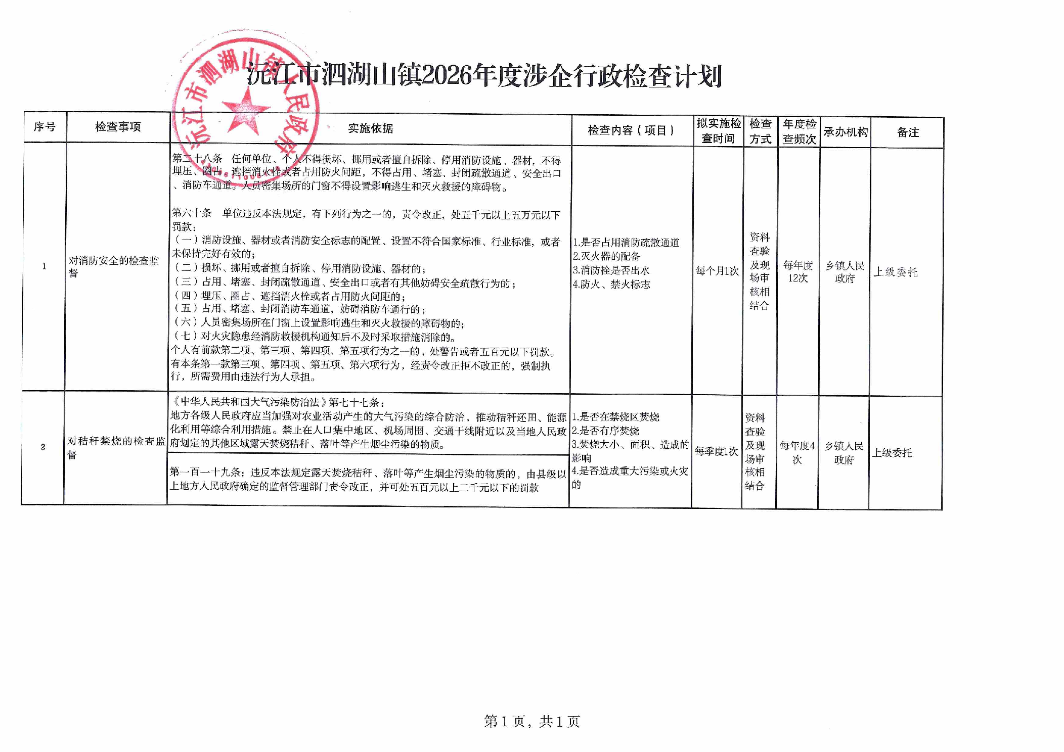 沅江市泗湖山镇2026年度涉企行政检查计划