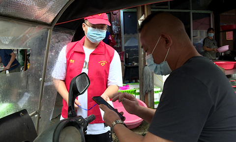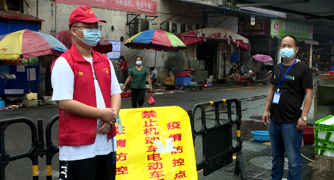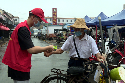 在湘北市场进出口,志愿者们正手持体温枪对进入市场的市民进行测温,并提醒大家注意好间隔距离、检查“三码”。这些志愿者中就有江健和他的儿子江宇鸿的身影。